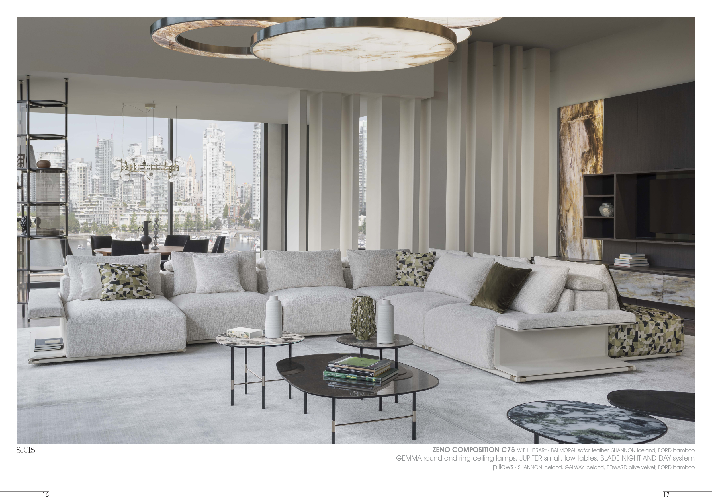 GEMMA round and ring ceiling lamps, JUPITER small, low tables, BLADE NIGHT AND DAY system
