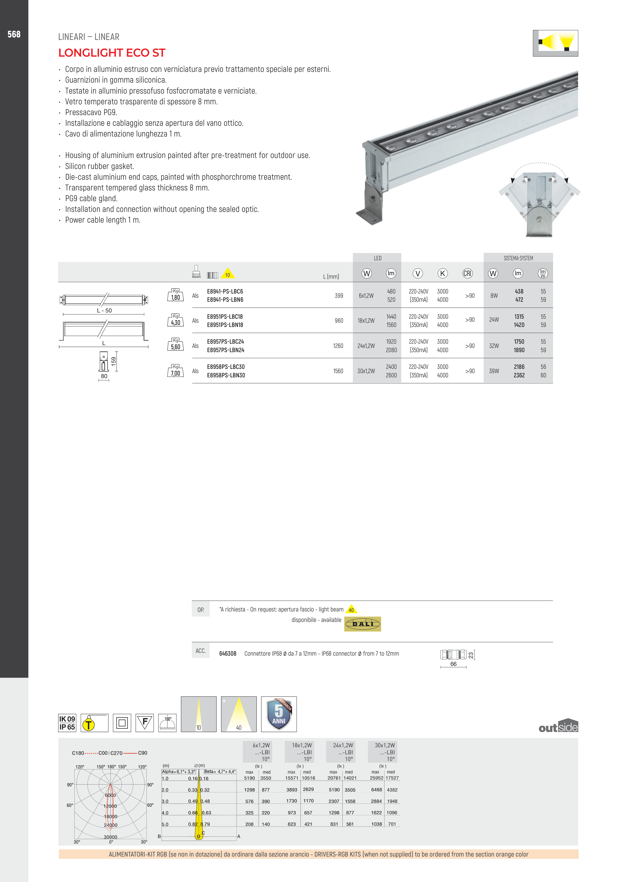 • Corpo in alluminio estruso con verniciatura previo trattamento speciale per esterni.