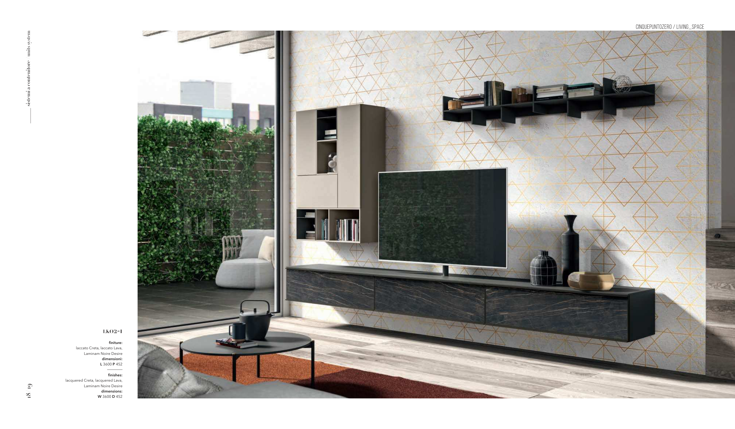 LK02-1 finiture: laccato Creta, laccato Lava, Laminam Noire Desire dimensioni: L 3600 P 452 finishes: lacquered Creta, lacquered Lava, Laminam Noire Desire dimensions: W 3600 D 452 CINQUEPUNTOZERO / LIVING_SPACE sistemi a contenitore / units system 18/ 19