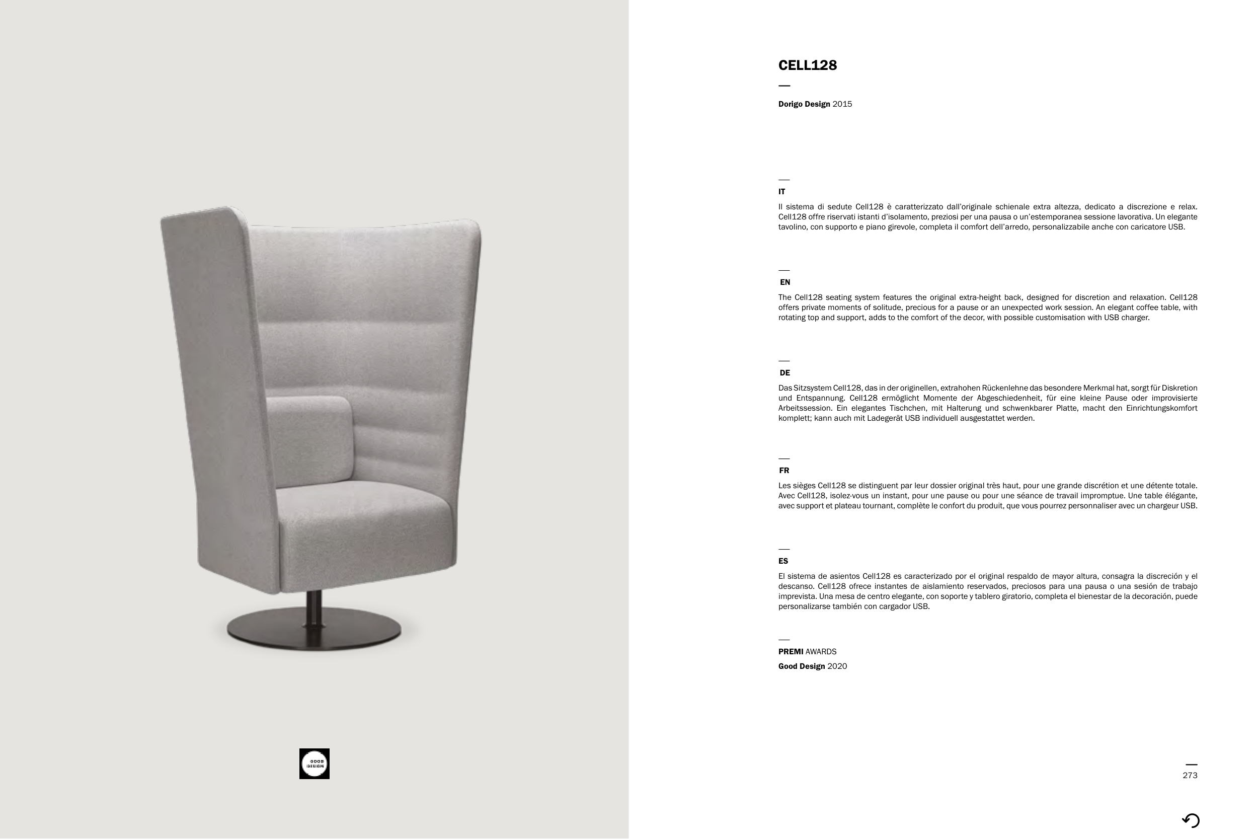 The Cell128 seating system features the original extra-height back, designed for discretion and relaxation. Cell128