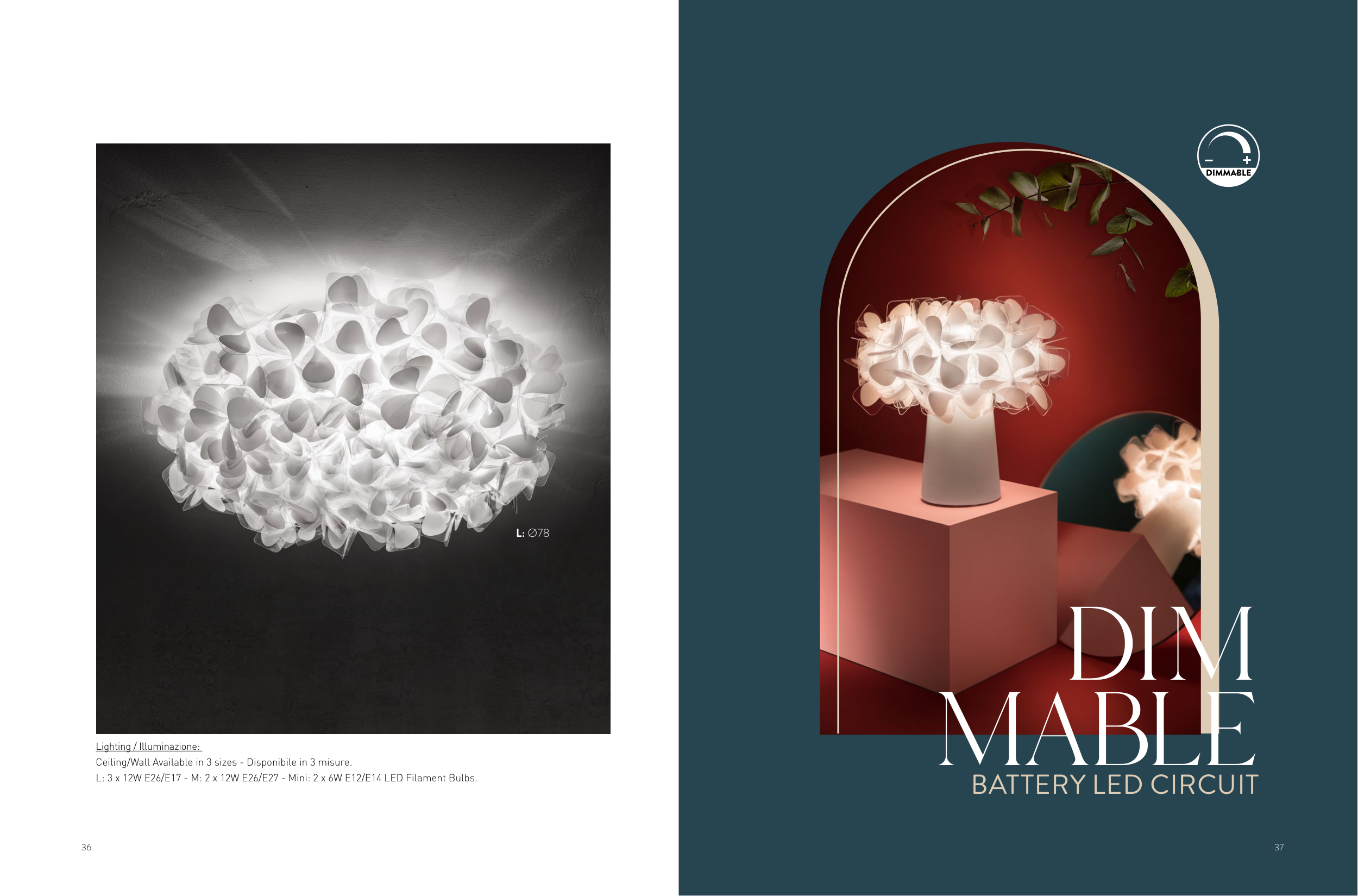 36 DIM MABLE BATTERY LED CIRCUIT L: Ø78 Lighting / Illuminazione: Ceiling/Wall Available in 3 sizes - Disponibile in 3 misure. L: 3 x 12W E26/E17 - M: 2 x 12W E26/E27 - Mini: 2 x 6W E12/E14 LED Filament Bulbs. 37