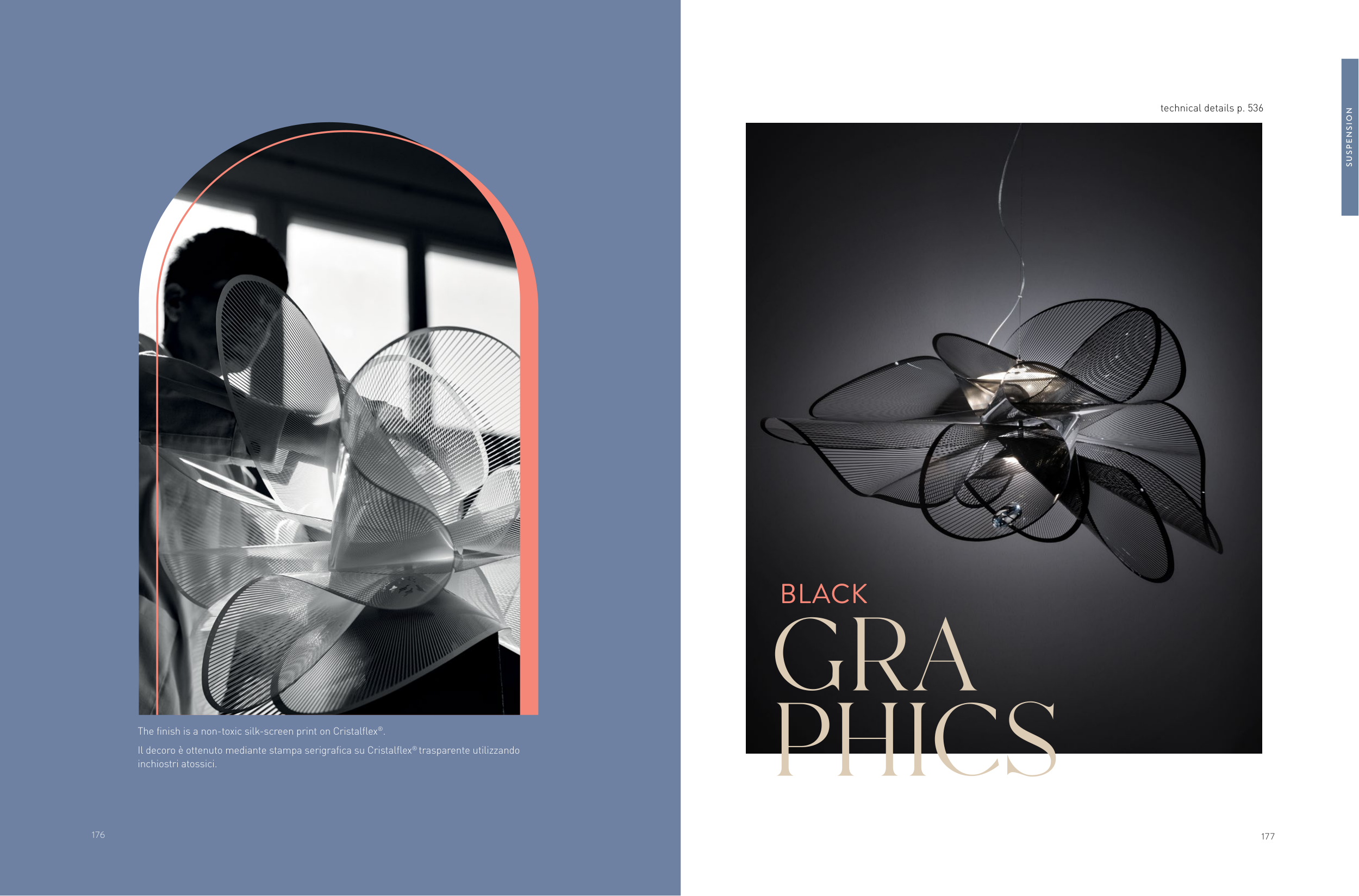 177 The finish is a non-toxic silk-screen print on Cristalflex®. Il decoro è ottenuto mediante stampa serigrafica su Cristalflex® trasparente utilizzando inchiostri atossici. DOUBLE LED LIGHT SOURCE GRA PHICS BLACK SUSPENSION technical details p. 536 176