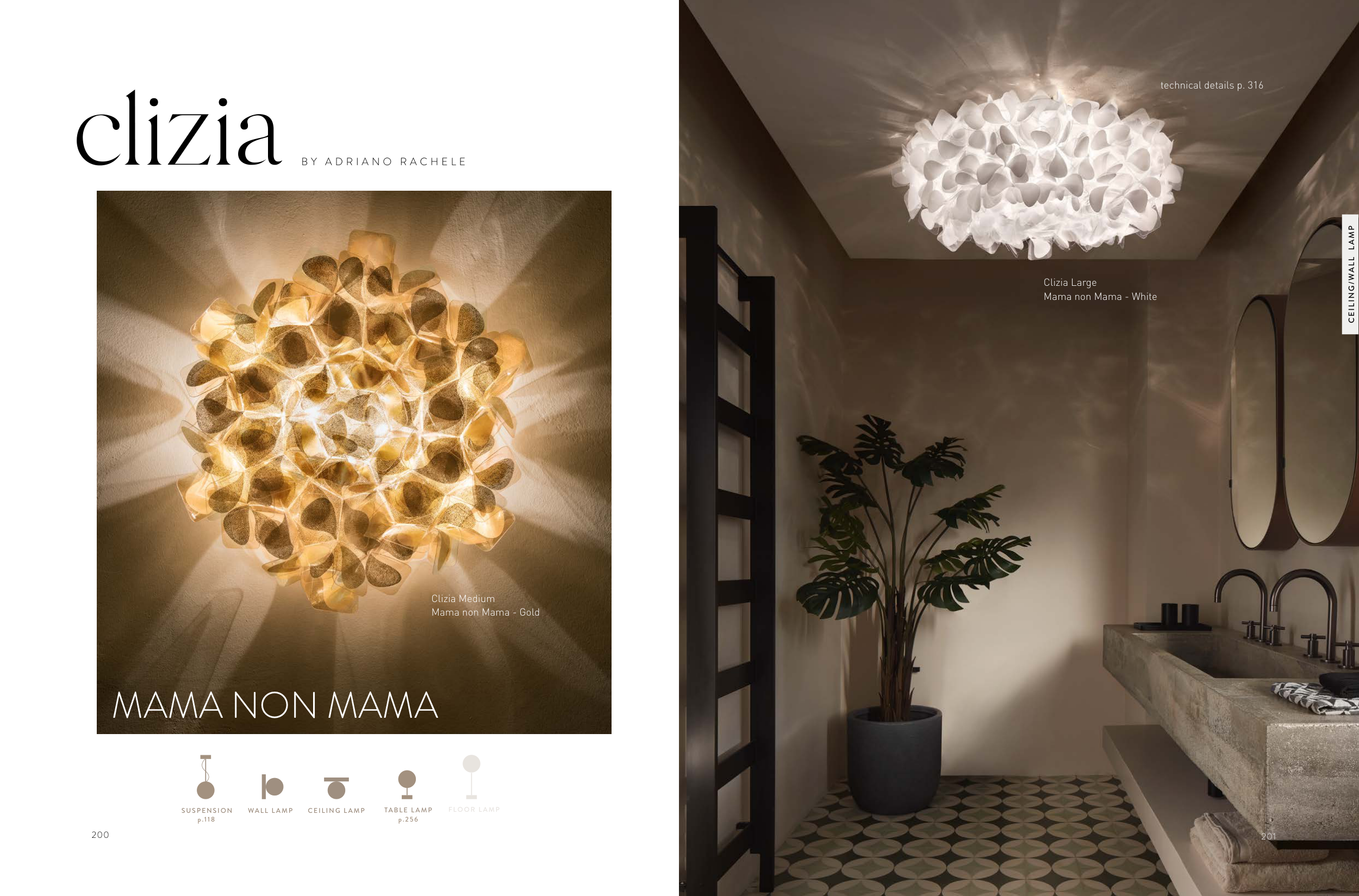 201 200 clizia CEILING L AMP WALL L AMP TABLE L AMP FLOOR L AMP SUSPENSION p.256 B Y A D R I A N O R A C H E L E Clizia Medium Mama non Mama - Gold 201 technical details p. 316 Clizia Large Mama non Mama - White p.118 CEILING/WALL L AMP MAMA NON MAMA