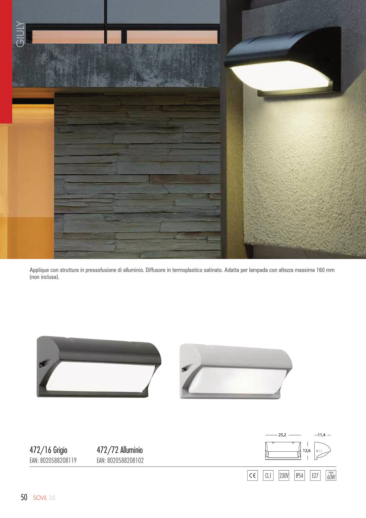 Applique con struttura in pressofusione di alluminio. Diffusore in termoplastico satinato. Adatta per lampada con altezza massima 160 mm
