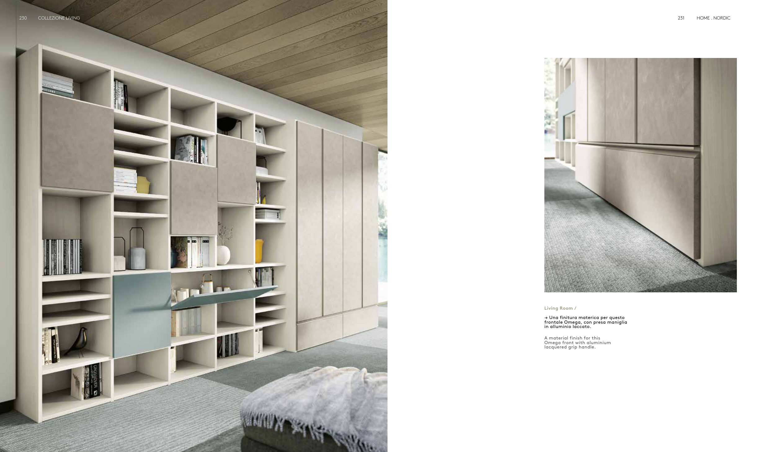Living Room / → Una finitura materica per questo frontale Omega, con presa maniglia in alluminio laccato. A material finish for this Omega front with aluminium lacquered grip handle. 231 HOME . NORDIC 230 COLLEZIONE LIVING