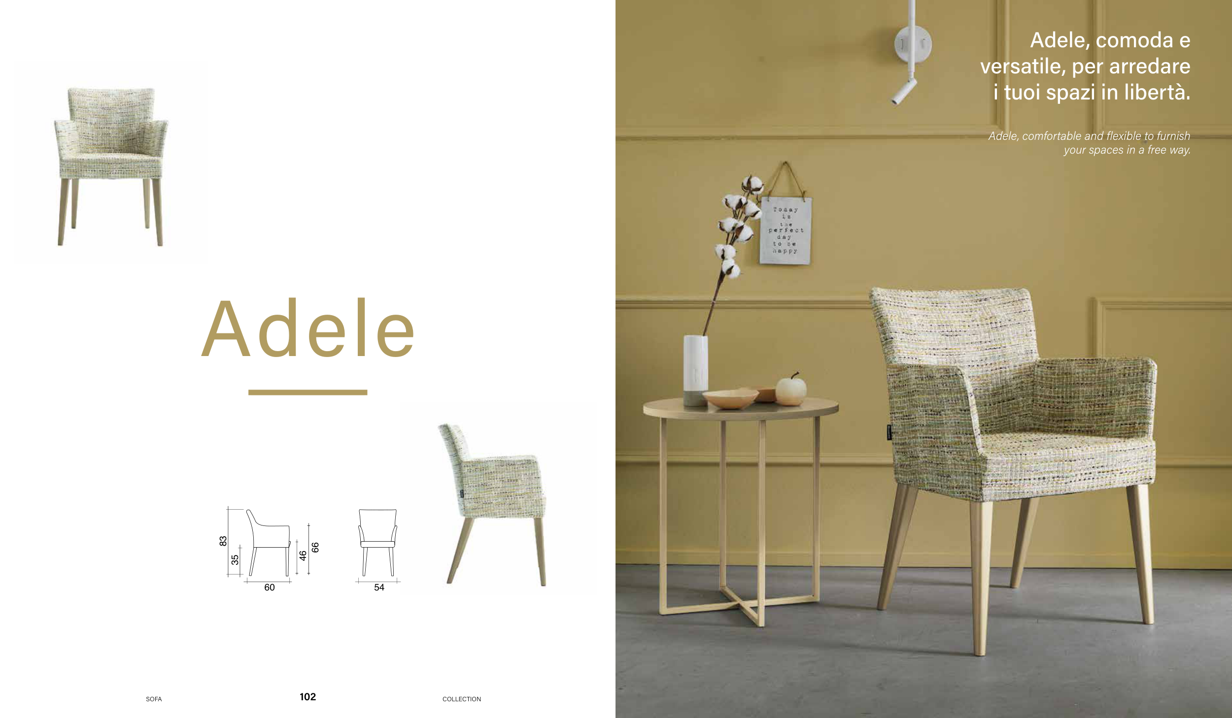 102 SOFA COLLECTION 103 SOFA COLLECTION Adele, comoda e versatile, per arredare i tuoi spazi in libertà. Adele, comfortable and flexible to furnish your spaces in a free way. Adele 83 35 46 60 66 54