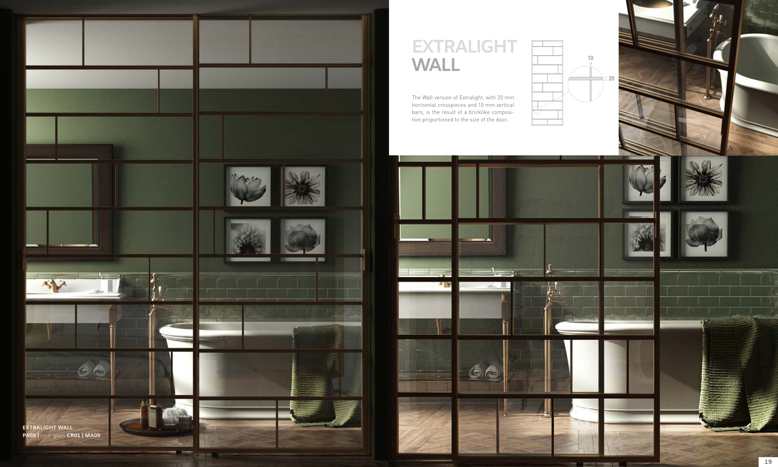 10 20 EXTRALIGHT WALL The Wall version of Extralight, with 20 mm horizontal crosspieces and 10 mm vertical bars, is the result of a bricklike composi- tion proportioned to the size of the door.. EXTRALIGHT WALL PA05 | clear glass CR01 | MA09 19