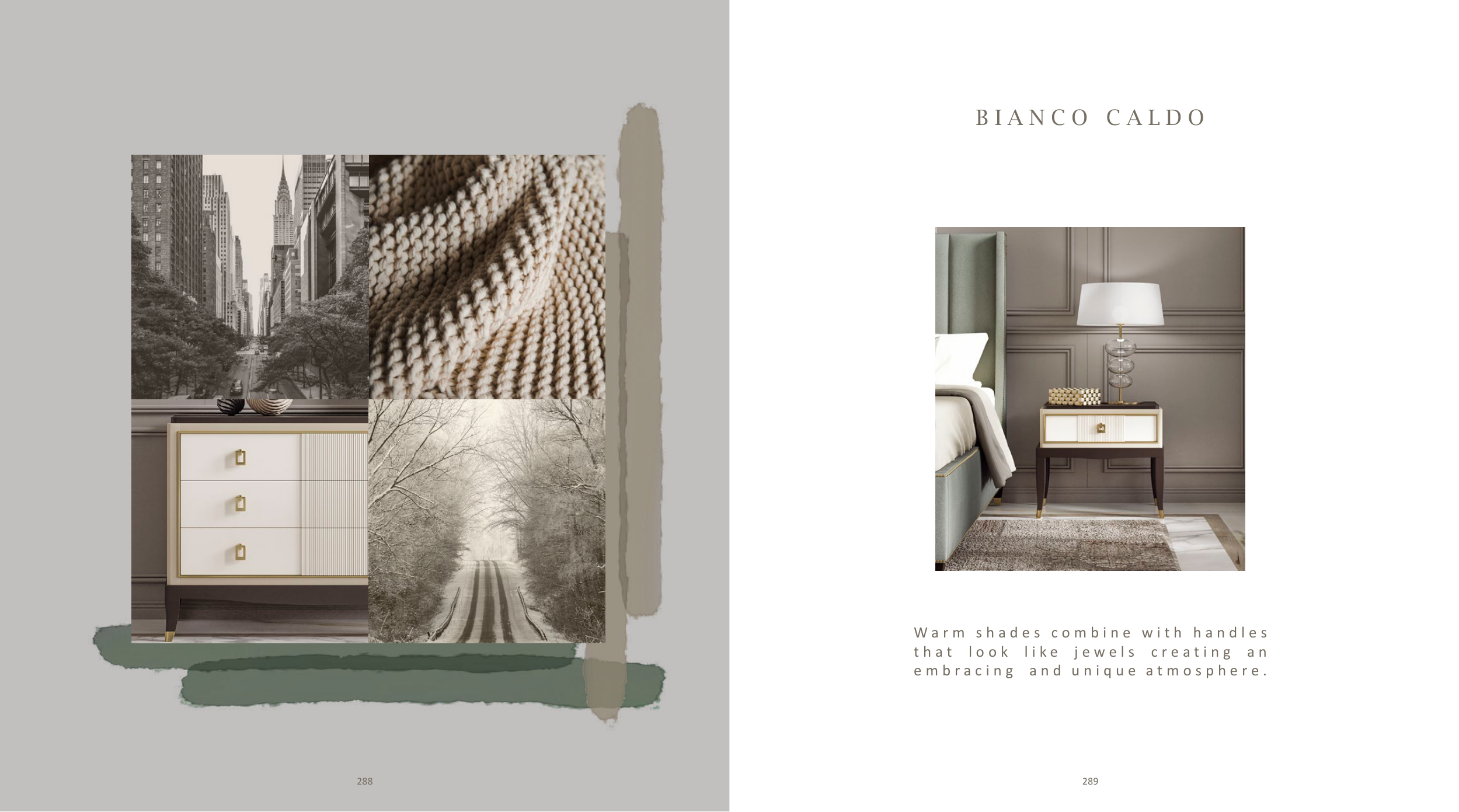 B I A N C O C A L D O W a r m s h a d e s c o m b i n e w i t h h a n d l e s t h a t l o o k l i k e j e w e l s c r e a t i n g a n e m b r a c i n g a n d u n i q u e a t m o s p h e r e . 289 288