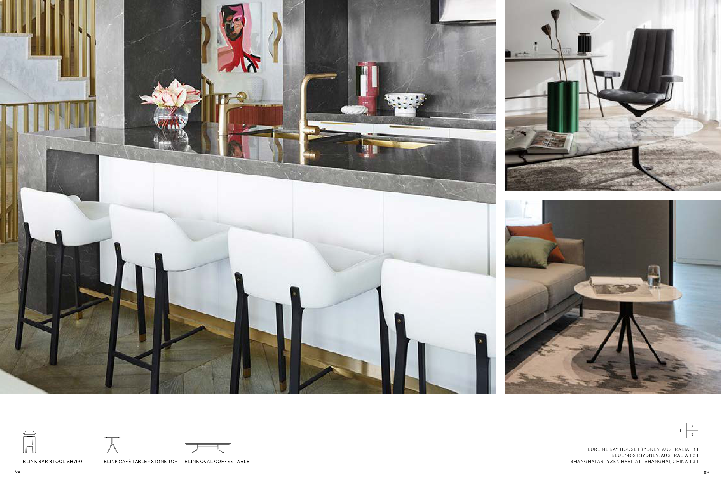 LURLINE BAY HOUSE | SYDNEY, AUSTRALIA [ 1 ] BLUE 1402 | SYDNEY, AUSTRALIA [ 2 ] SHANGHAI ARTYZEN HABITAT | SHANGHAI, CHINA [ 3 ] 1 2 3 BLINK OVAL COFFEE TABLE BLINK CAFÉ TABLE - STONE TOP BLINK BAR STOOL SH750 68 69