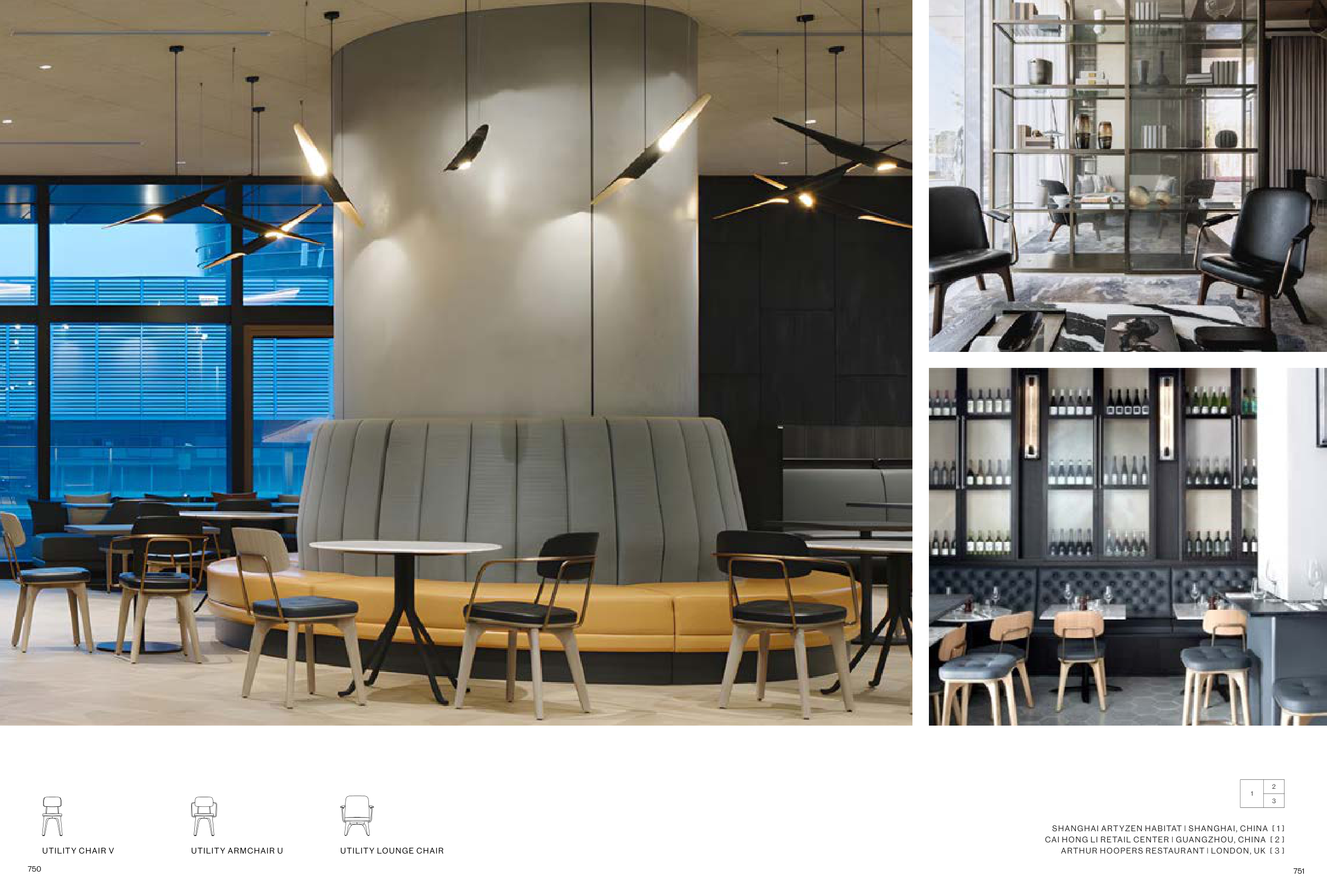 1 2 3 SHANGHAI ARTYZEN HABITAT | SHANGHAI, CHINA [ 1 ] CAI HONG LI RETAIL CENTER | GUANGZHOU, CHINA [ 2 ] ARTHUR HOOPERS RESTAURANT | LONDON, UK [ 3 ] UTILITY LOUNGE CHAIR UTILITY ARMCHAIR U UTILITY CHAIR V 750 751