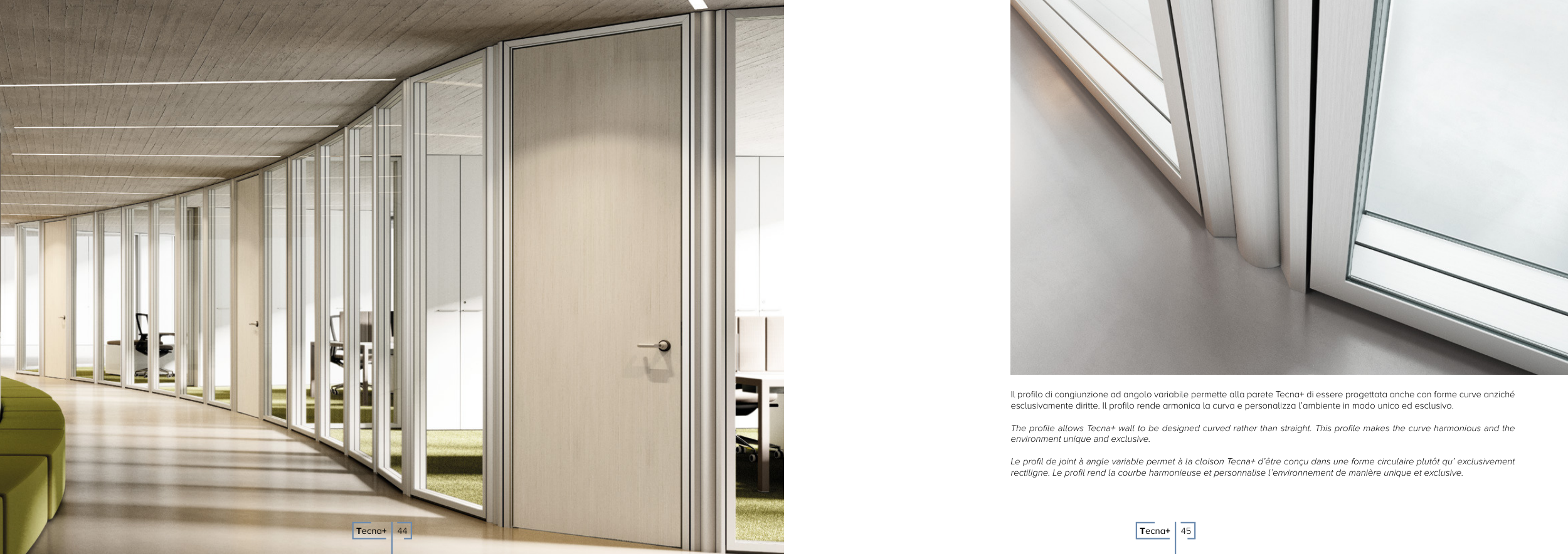 Il profilo di congiunzione ad angolo variabile permette alla parete Tecna+ di essere progettata anche con forme curve anziché