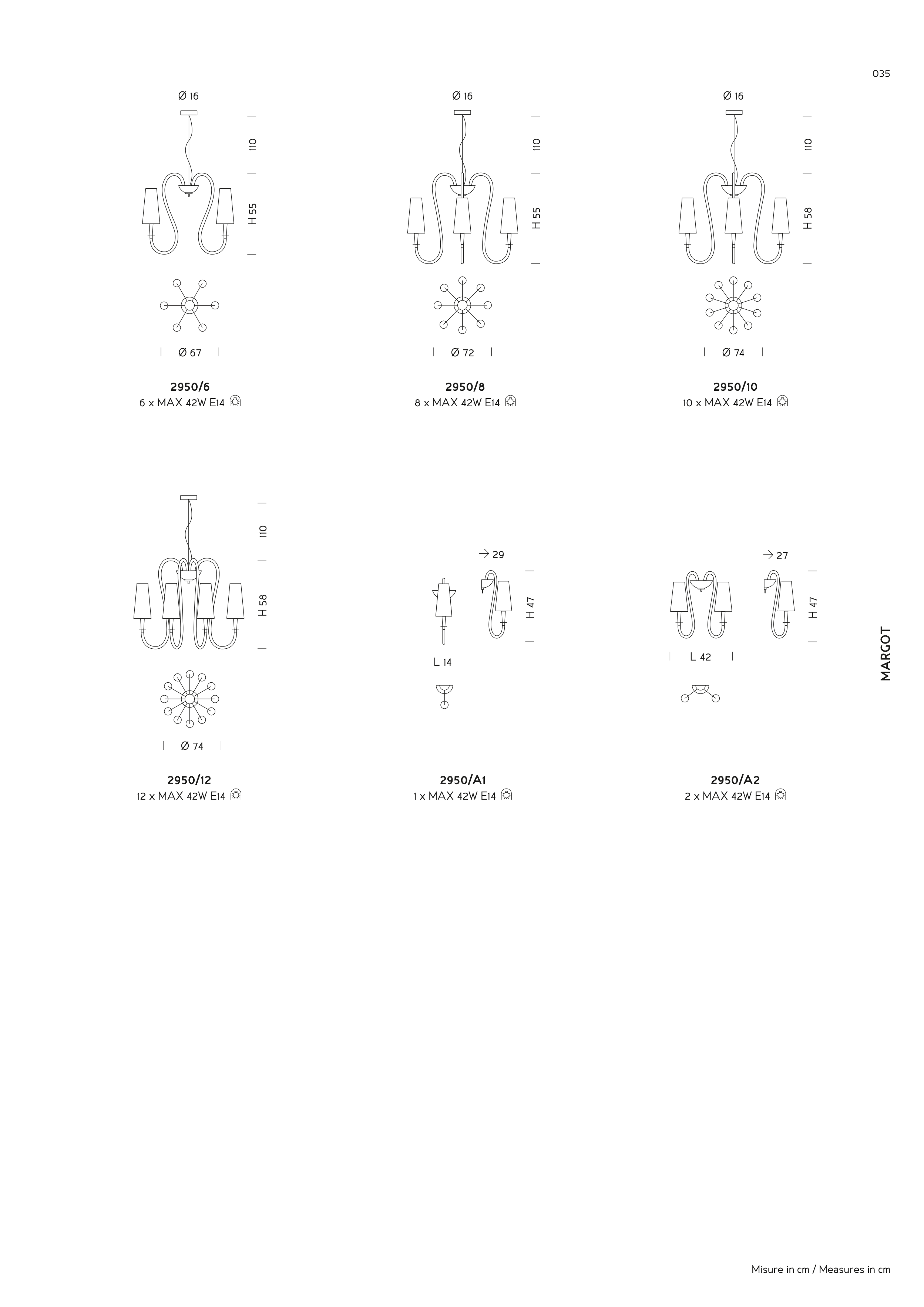 MARGOT 035 H 55 H 55 H 58 H 58 110 110 110 110 Ø 16 Ø 16 Ø 16 2950/6 6 x MAX 42W E14 2950/12 12 x MAX 42W E14 2950/8 8 x MAX 42W E14 2950/10 10 x MAX 42W E14 Ø 72 Ø 74 Ø 67 Ø 74 2950/A2 2 x MAX 42W E14 27 H 47 L 42 2950/A1 1 x MAX 42W E14 29 H 47 L 14 Misure in cm / Measures in cm