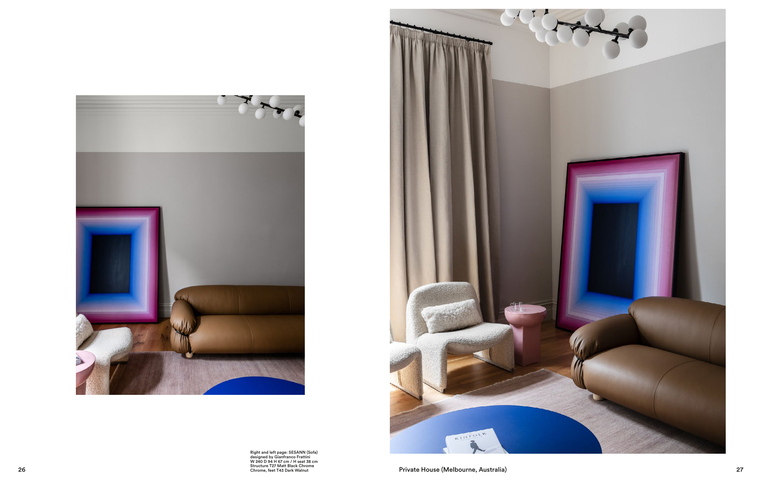 26 Private House (Melbourne, Australia) Right and left page: SESANN (Sofa) designed by Gianfranco Frattini W 240 D 94 H 67 cm / H seat 38 cm Structure T27 Matt Black Chrome Chrome, feet T43 Dark Walnut 27