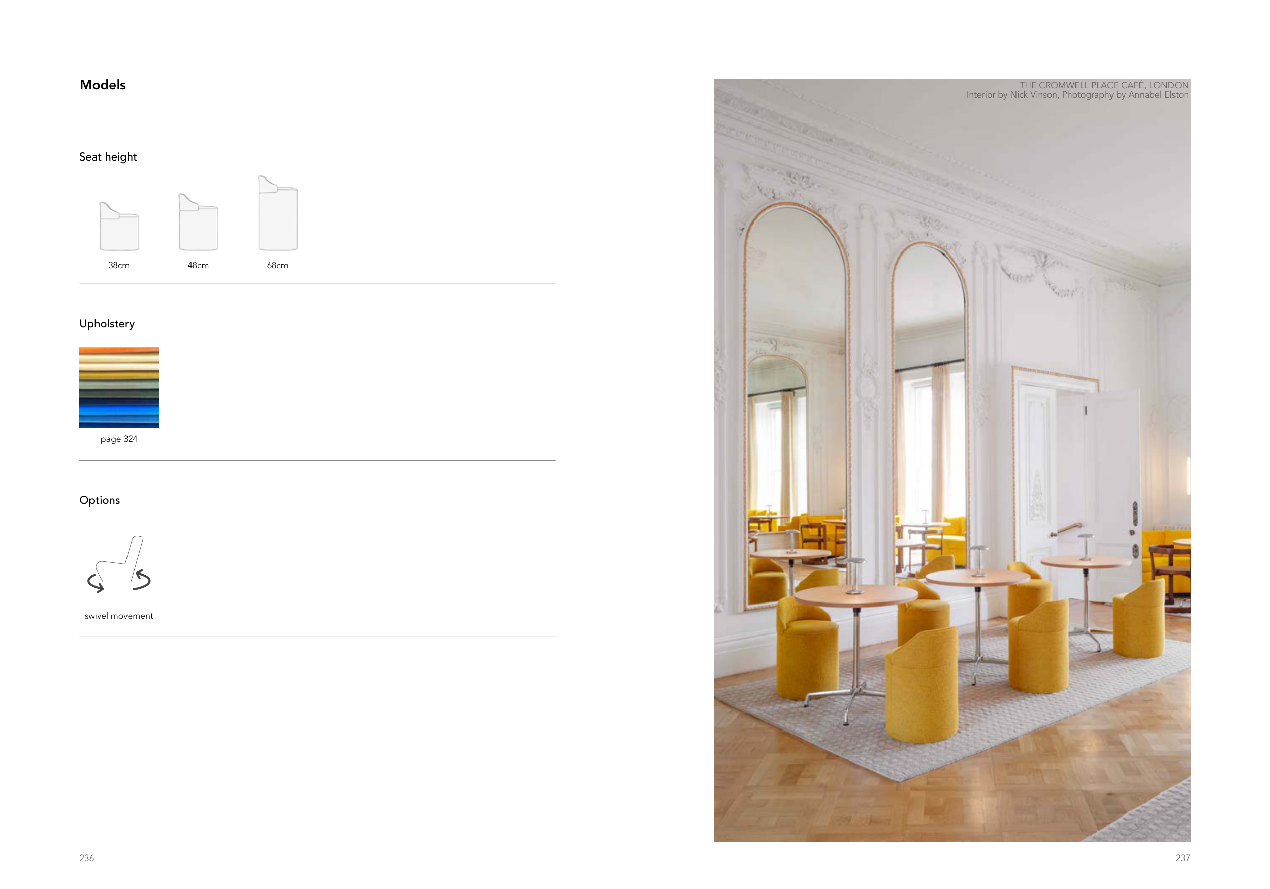 236 237 Models Seat height 38cm 48cm 68cm THE CROMWELL PLACE CAFÉ, LONDON Interior by Nick Vinson, Photography by Annabel Elston Upholstery page 324 Options swivel movement