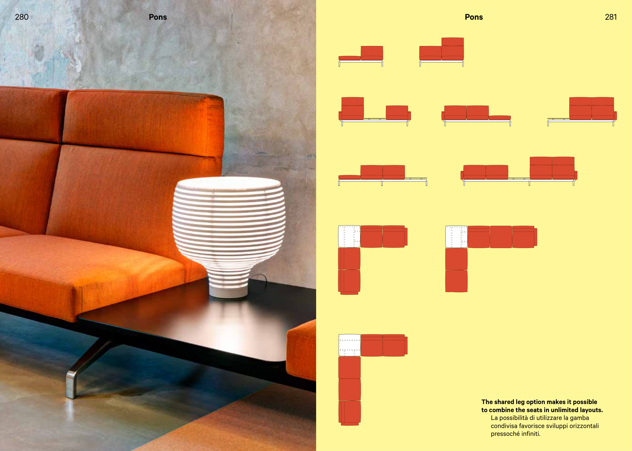 The shared leg option makes it possible to combine the seats in unlimited layouts. La possibilità di utilizzare la gamba condivisa favorisce sviluppi orizzontali pressoché infiniti. 281 280 Pons Pons