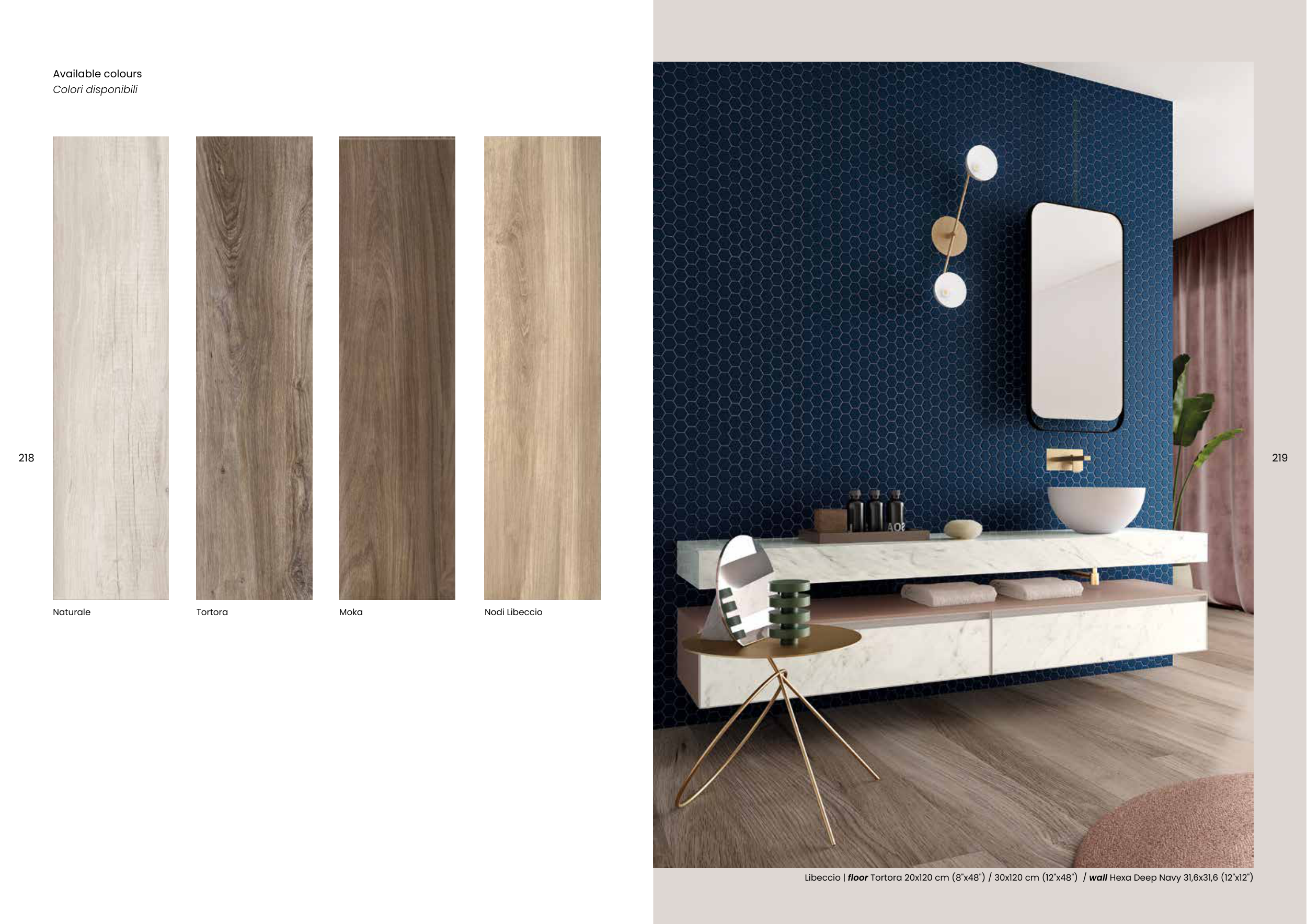 219 218 Available colours Colori disponibili Naturale Tortora Moka Nodi Libeccio Libeccio | floor Tortora 20x120 cm (8"x48") / 30x120 cm (12"x48") / wall Hexa Deep Navy 31,6x31,6 (12"x12")