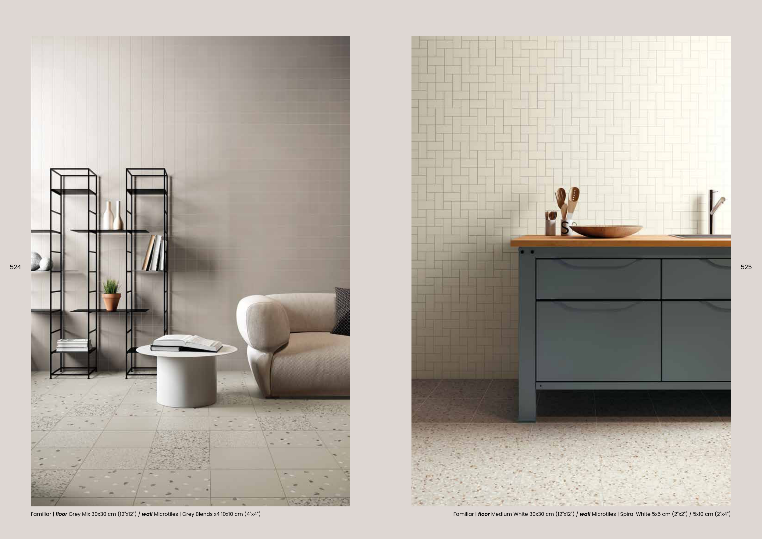 Familiar | floor Medium White 30x30 cm (12"x12") / wall Microtiles | Spiral White 5x5 cm (2"x2") / 5x10 cm (2"x4")