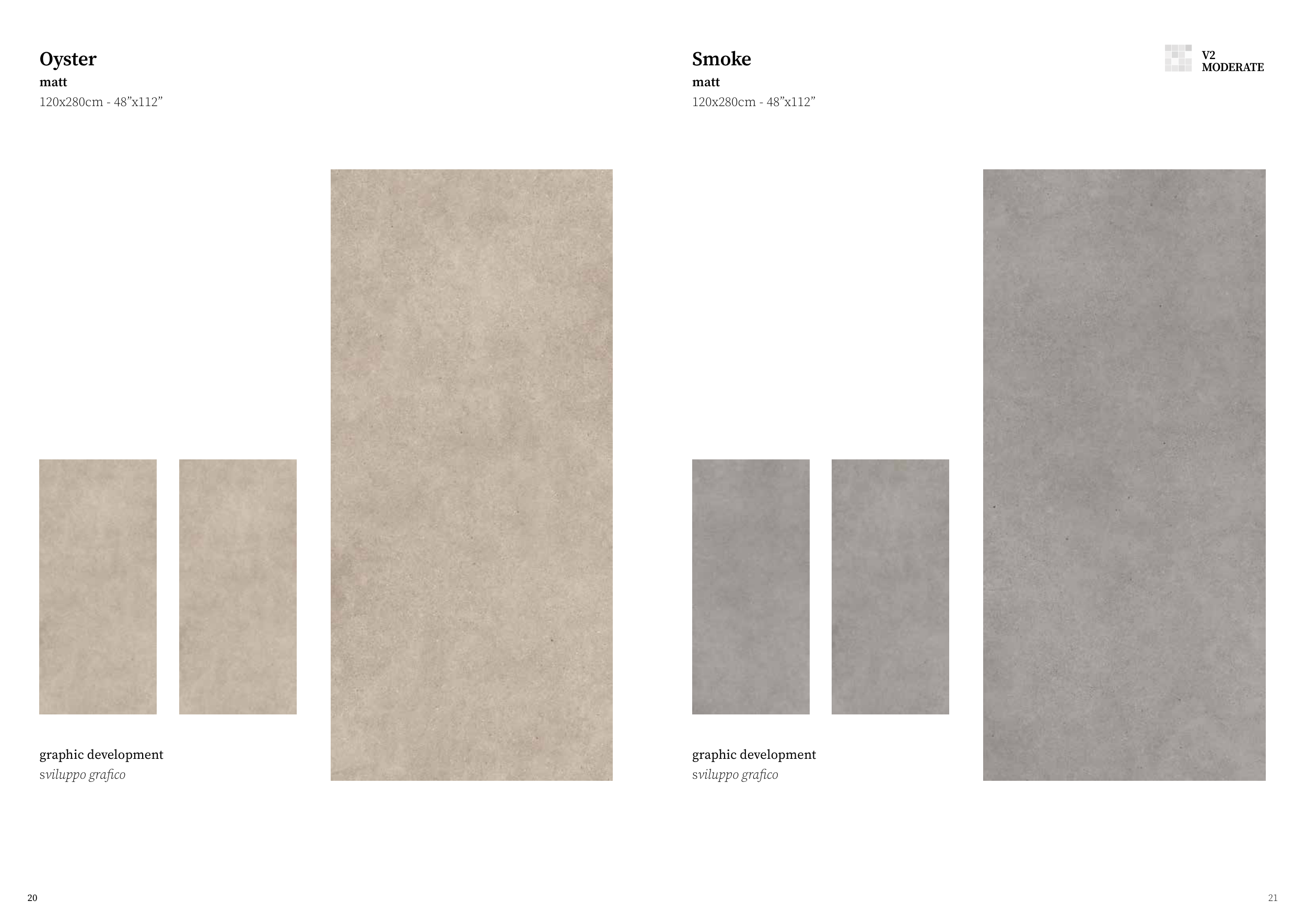 20 21 graphic development sviluppo grafico graphic development sviluppo grafico Oyster Smoke matt 120x280cm - 48”x112” matt 120x280cm - 48”x112” V2 MODERATE