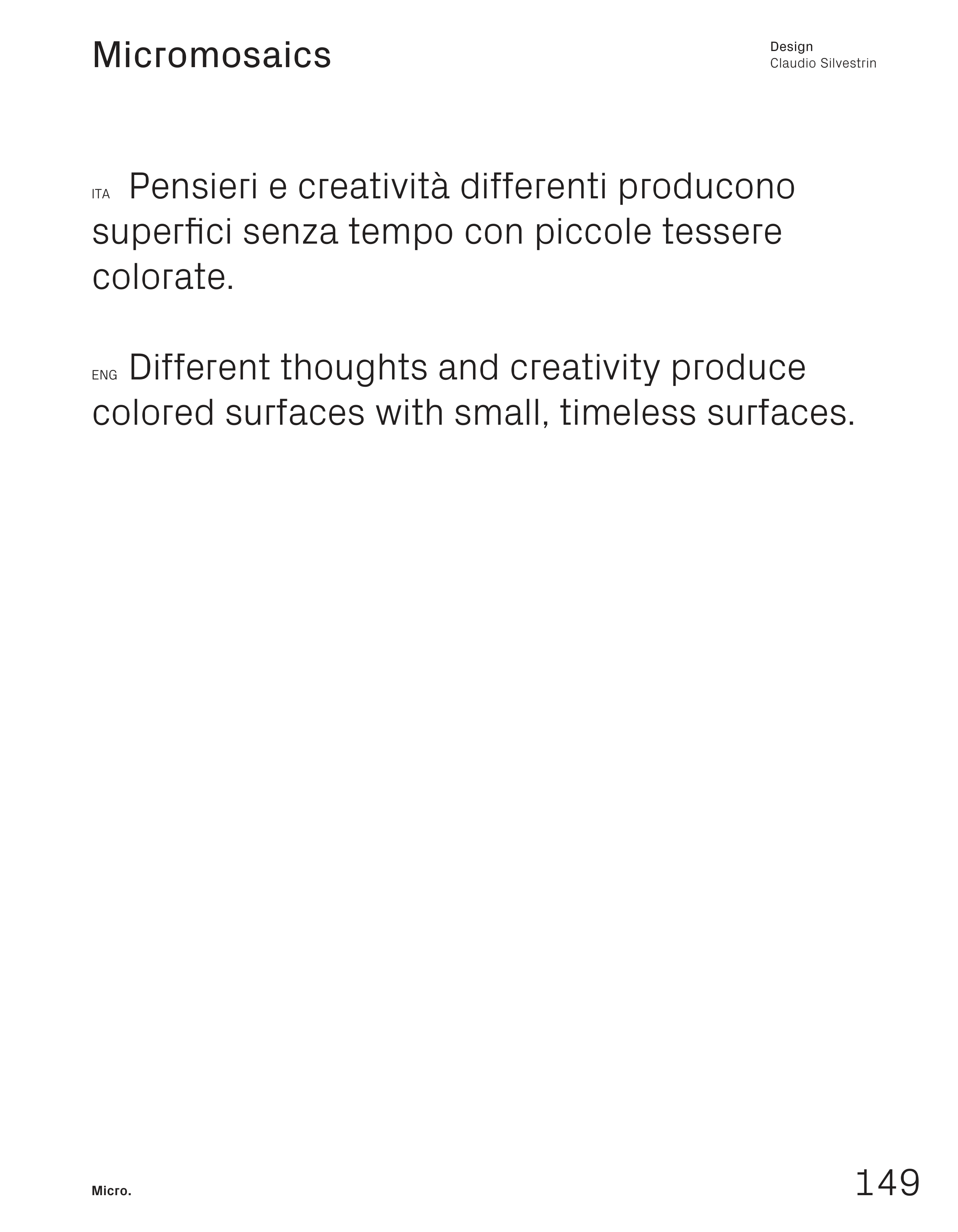 149 Micro. Micromosaics Design Claudio Silvestrin ITA Pensieri e creatività differenti producono superfici senza tempo con piccole tessere colorate. ENG Different thoughts and creativity produce colored surfaces with small, timeless surfaces.