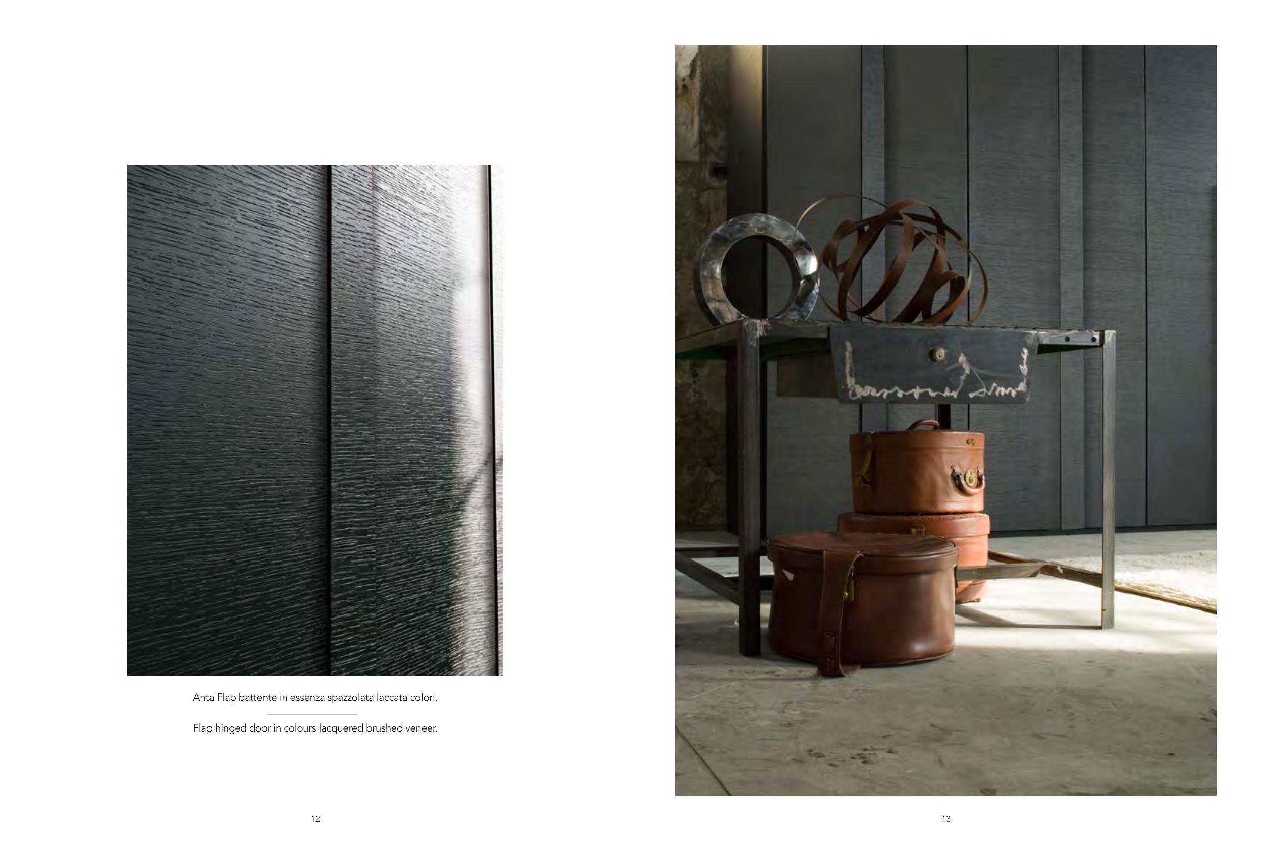 Flap hinged door in colours lacquered brushed veneer.