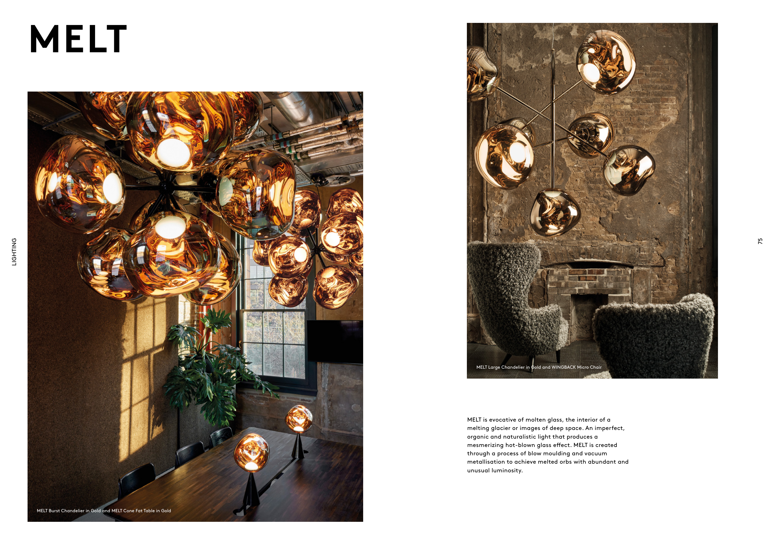 MELT Large Chandelier in Gold and WINGBACK Micro Chair