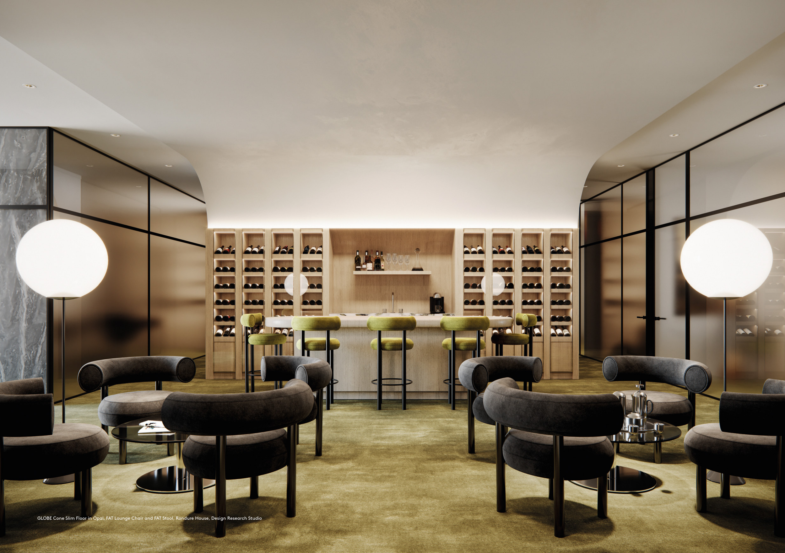 GLOBE Cone Slim Floor in Opal, FAT Lounge Chair and FAT Stool, Rondure House, Design Research Studio