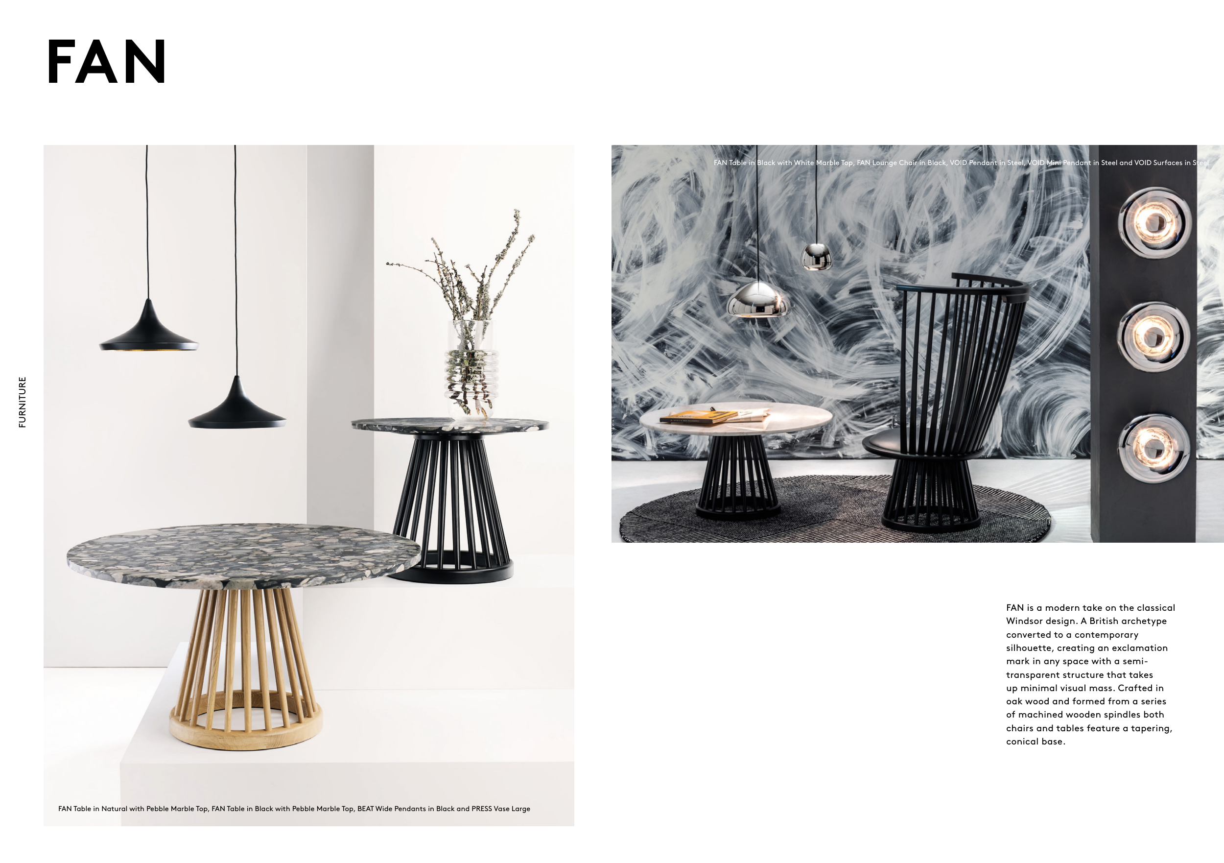 FAN Table in Natural with Pebble Marble Top, FAN Table in Black with Pebble Marble Top, BEAT Wide Pendants in Black and PRESS Vase Large
