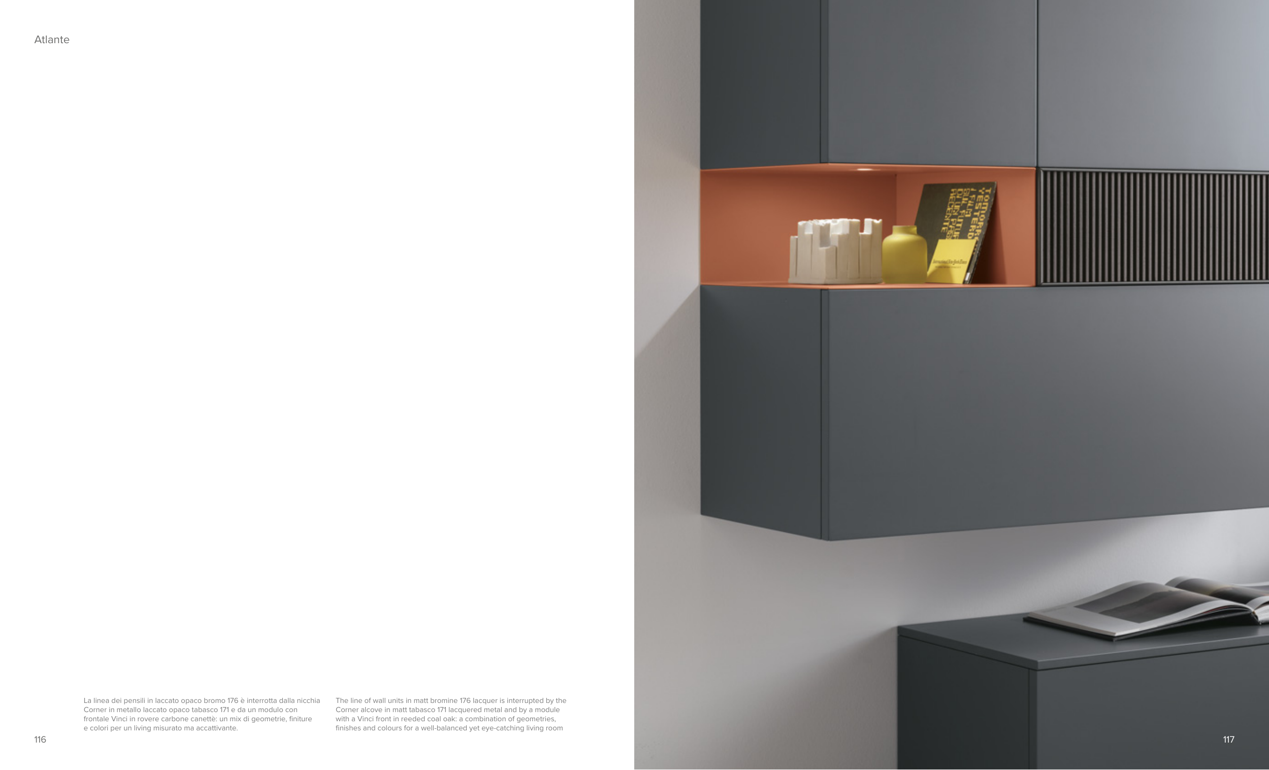 La linea dei pensili in laccato opaco bromo 176 è interrotta dalla nicchia