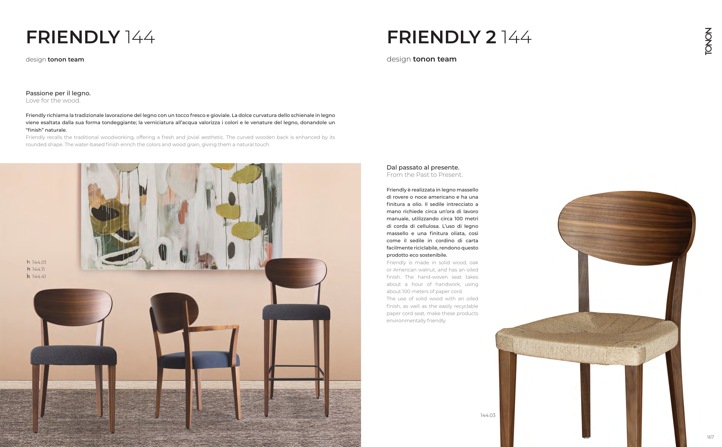 Friendly richiama la tradizionale lavorazione del legno con un tocco fresco e gioviale. La dolce curvatura dello schienale in legno