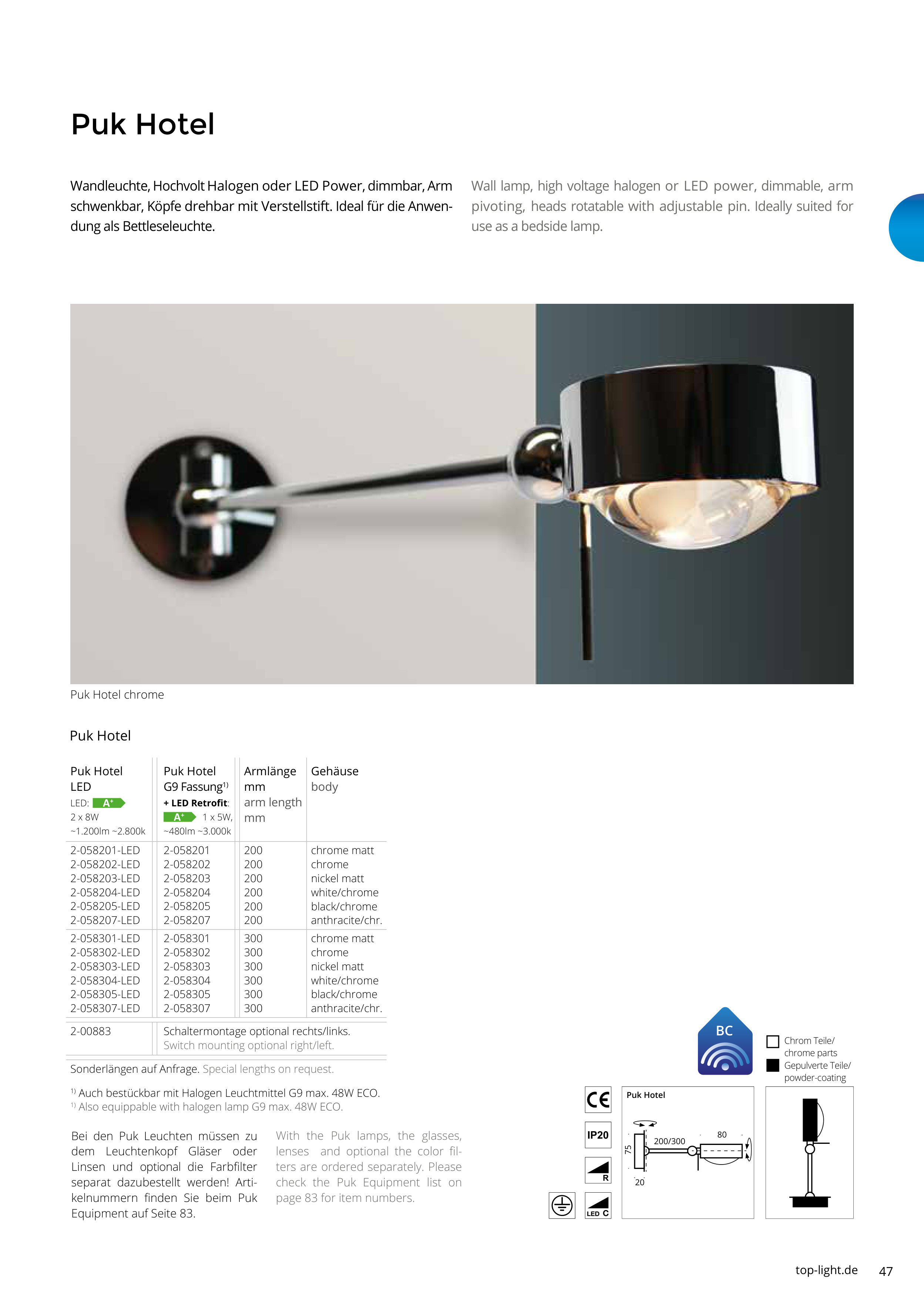 Wall lamp, high voltage halogen or LED power, dimmable, arm