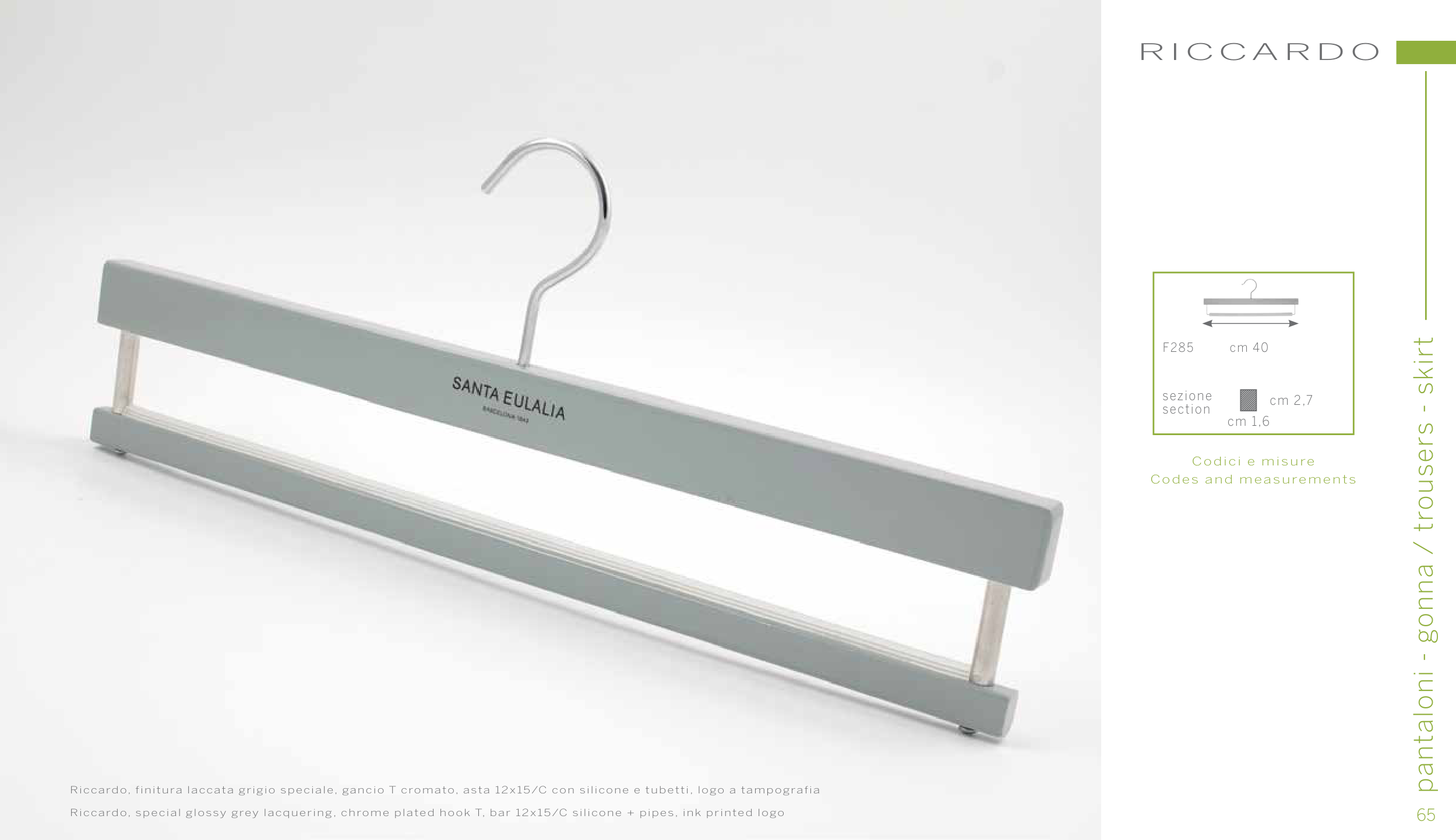 Riccardo, finitura laccata grigio speciale, gancio T cromato, asta 12x15/C con silicone e tubetti, logo a tampografia