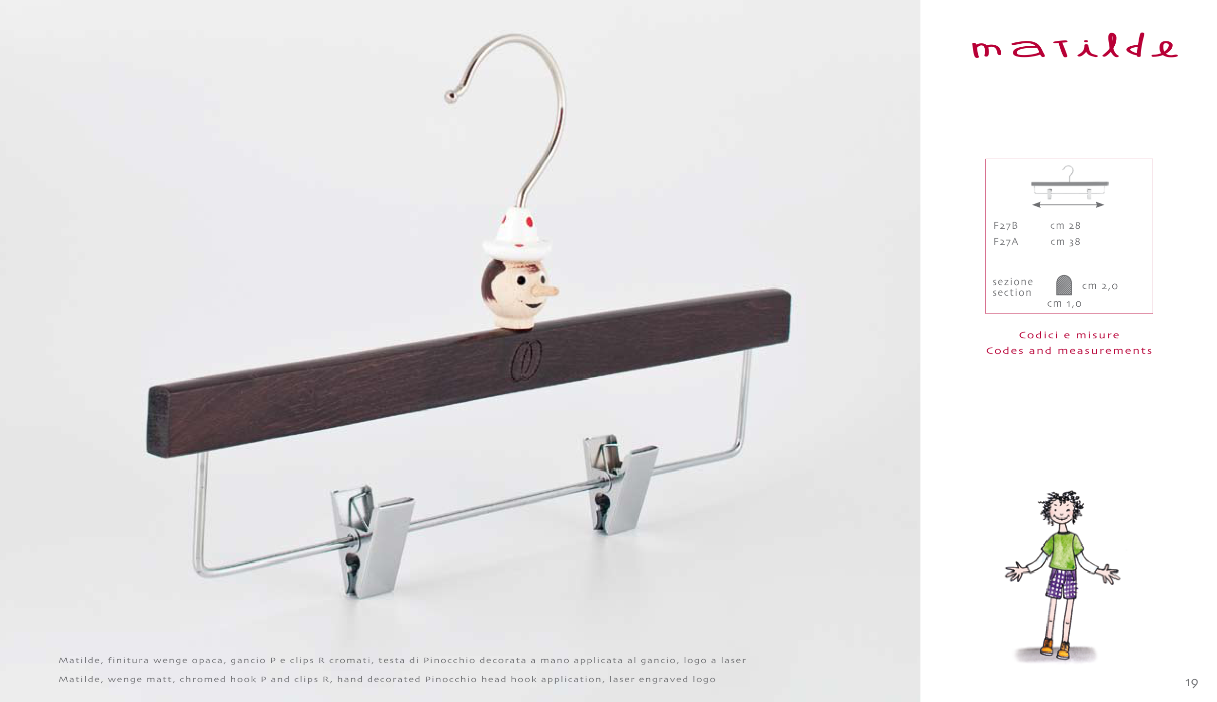Matilde, wenge matt, chromed hook P and clips R, hand decorated Pinocchio head hook application, laser engraved logo