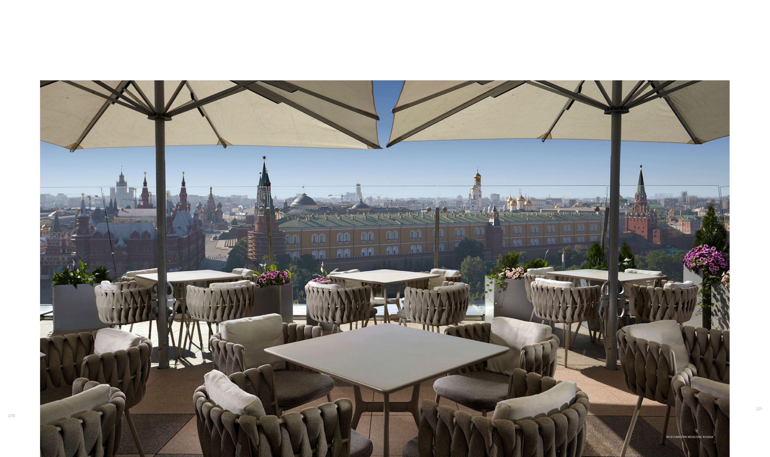 270 271 PAVILION DAYBED IN WENGÉ ALUMINIUM WITH ROOF IN SUNVISION NATURE GREY. CUSHION IN REVIVE JASPE AND DECO CUSHIONS IN NATTÉ OLIVE & NATTÉ FOREST. LANTERNS HIGH AND LOW. RITZ-CARLTON MOSCOW, RUSSIA