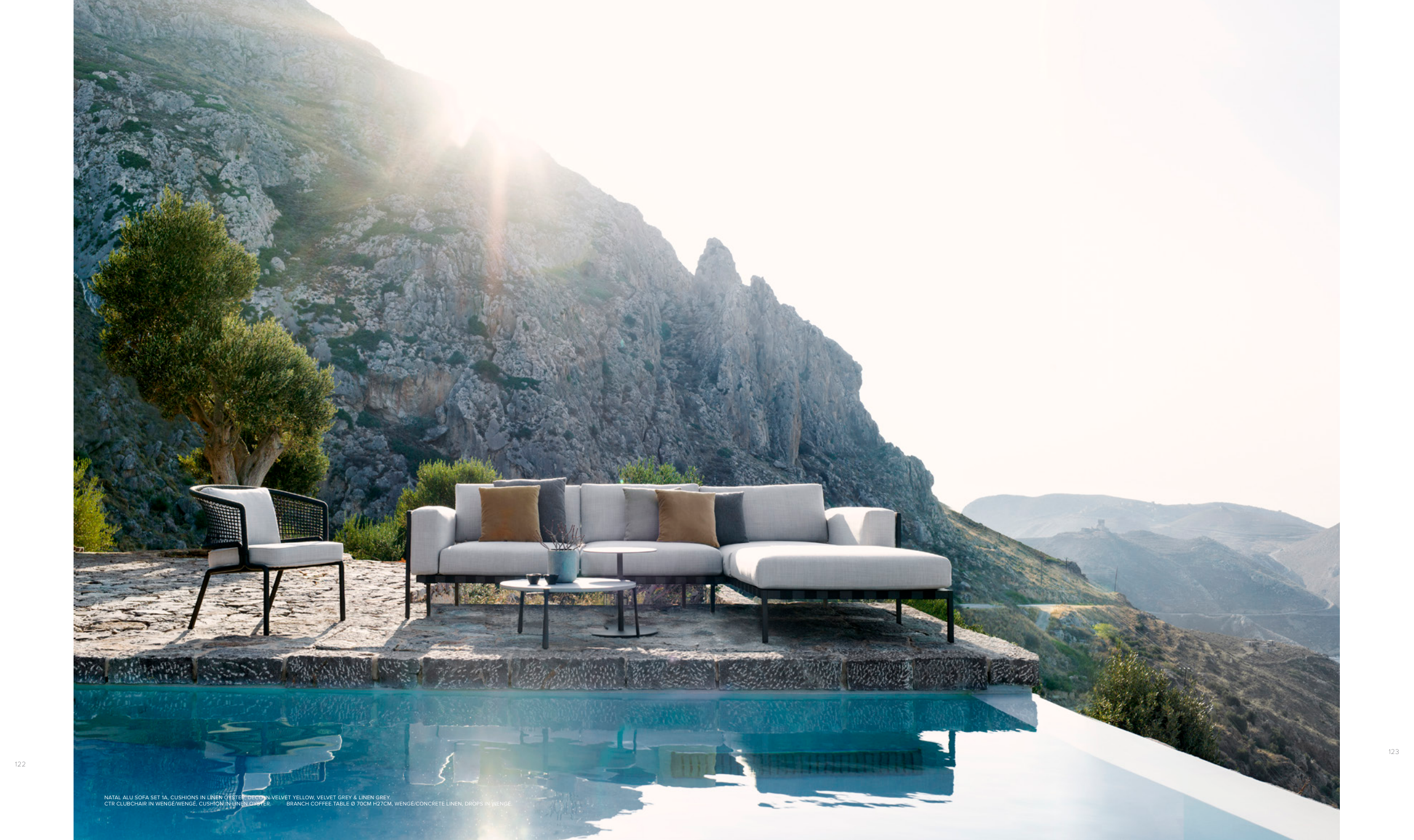 CTR CLUBCHAIR IN WENGÉ/WENGÉ, CUSHION IN LINEN OYSTER. BRANCH COFFEE TABLE Ø 70CM H27CM, WENGÉ/CONCRETE LINEN, DROPS IN WENGÉ.