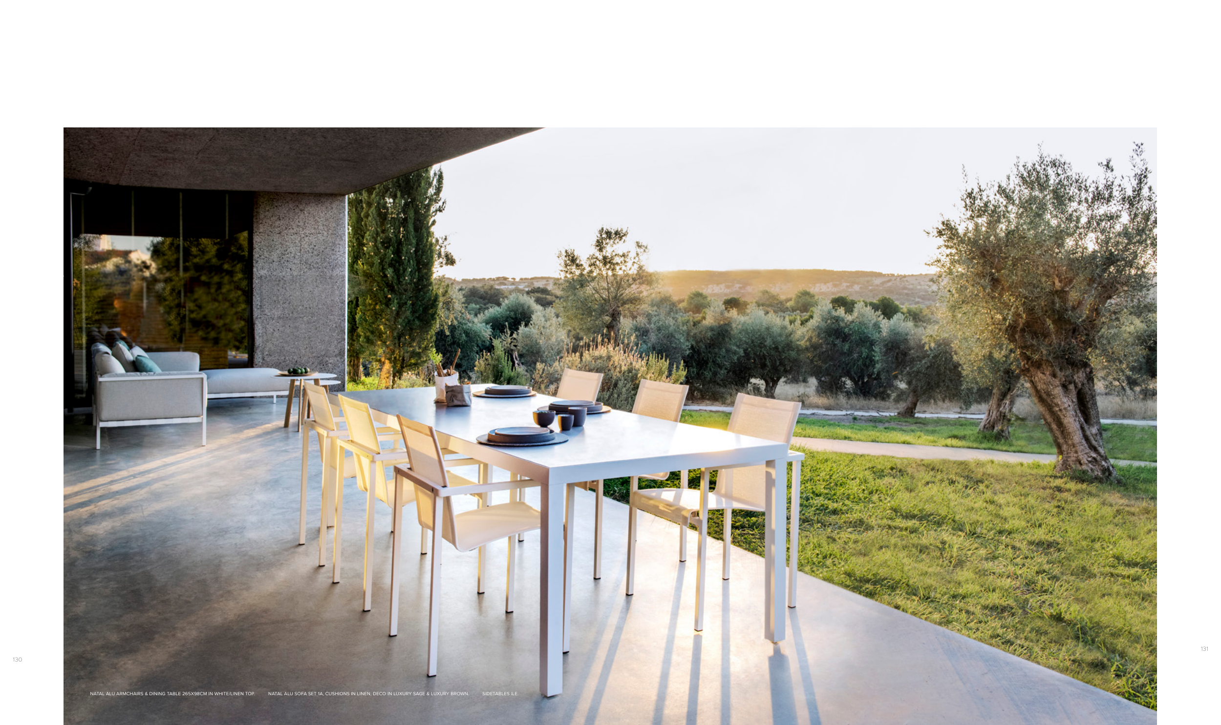130 131 NATAL ALU ARMCHAIRS & DINING TABLE 265X98CM IN WHITE/LINEN TOP. NATAL ALU SOFA SET 1A, CUSHIONS IN LINEN, DECO IN LUXURY SAGE & LUXURY BROWN. SIDETABLES ILE.