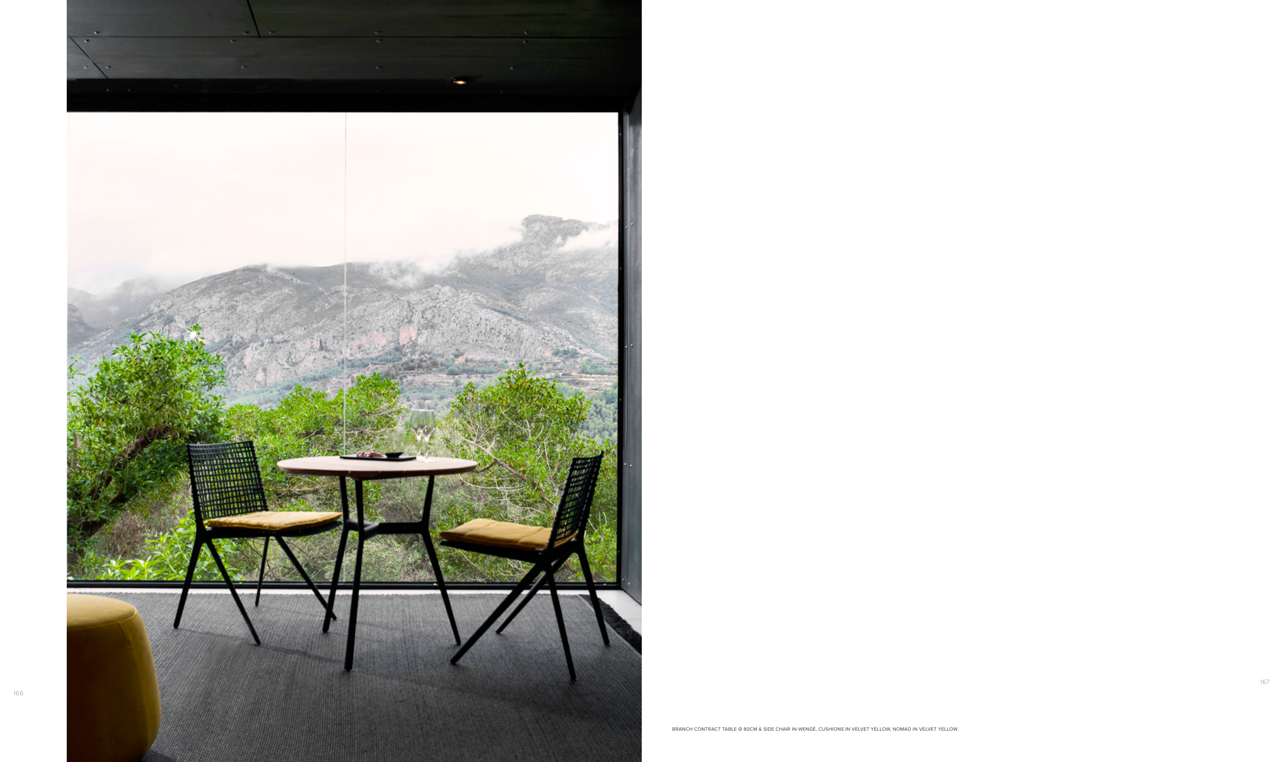 BRANCH CONTRACT TABLE Ø 80CM & SIDE CHAIR IN WENGÉ, CUSHIONS IN VELVET YELLOW, NOMAD IN VELVET YELLOW.