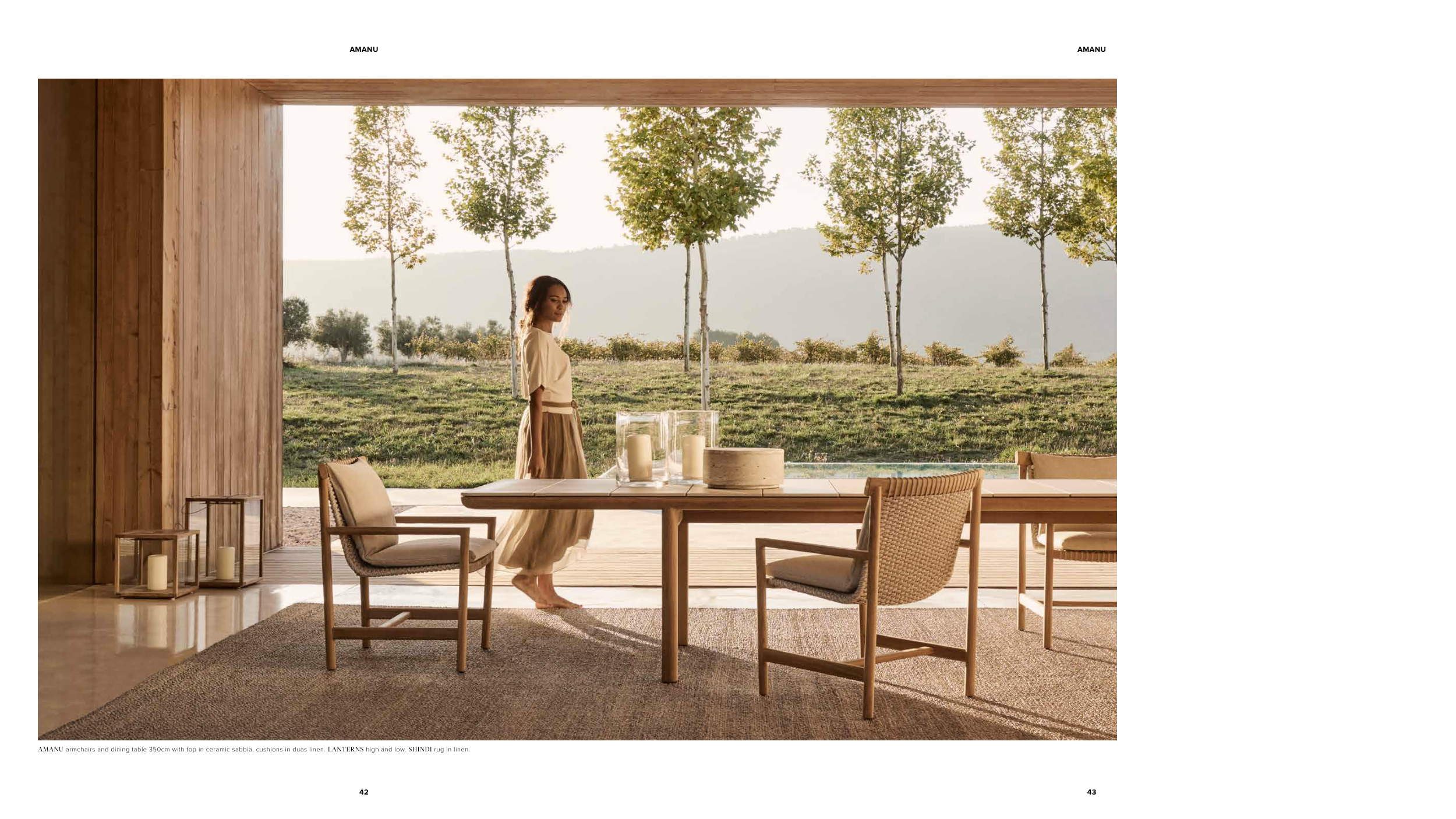 42 43 AMANU AMANU AMANU armchairs and dining table 350cm with top in ceramic sabbia, cushions in duas linen. LANTERNS high and low. SHINDI rug in linen.