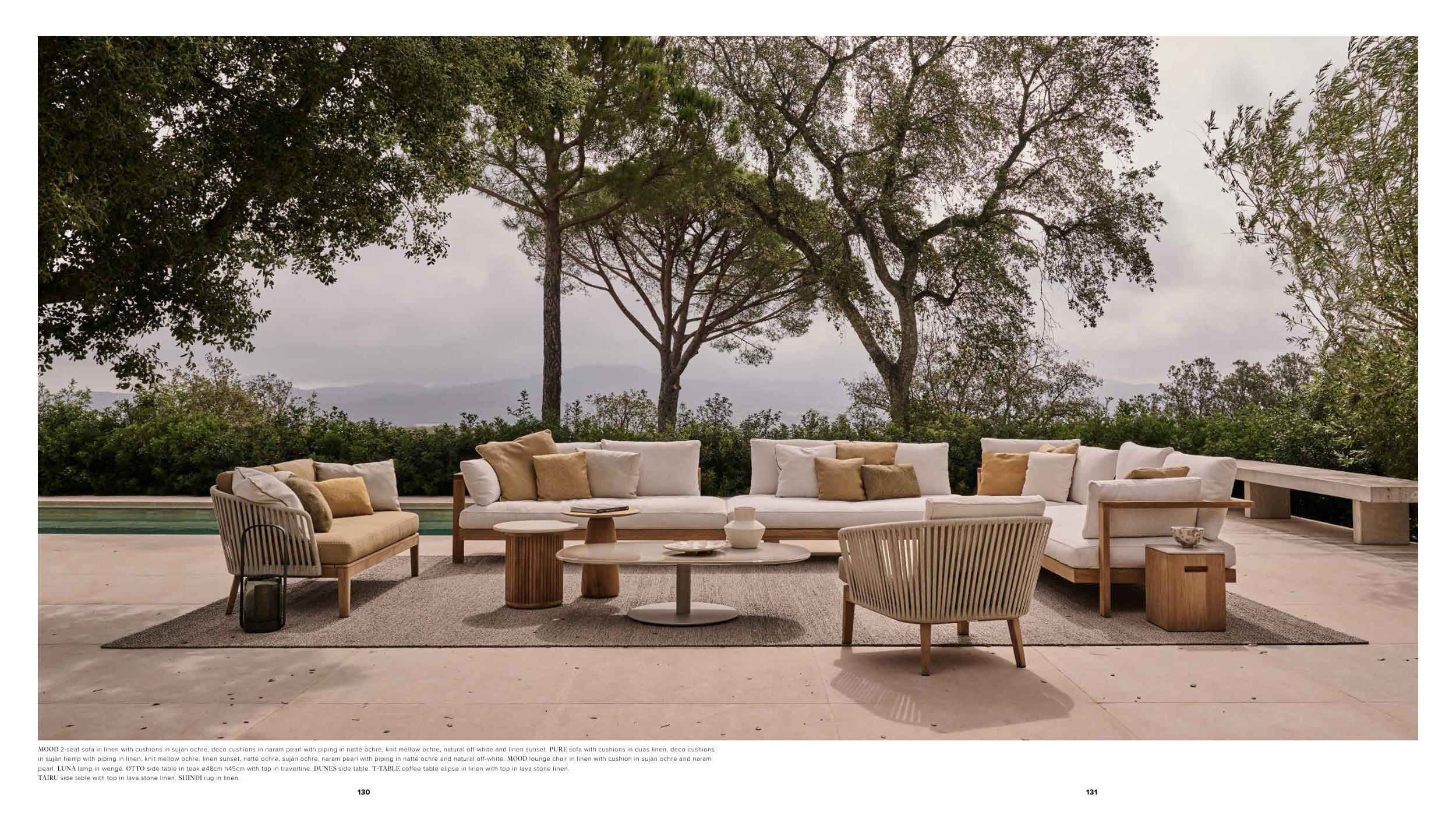 pearl. LUNA lamp in wengé. OTTO side table in teak ø48cm h45cm with top in travertine. DUNES side table. T-TABLE coffee table elipse in linen with top in lava stone linen.