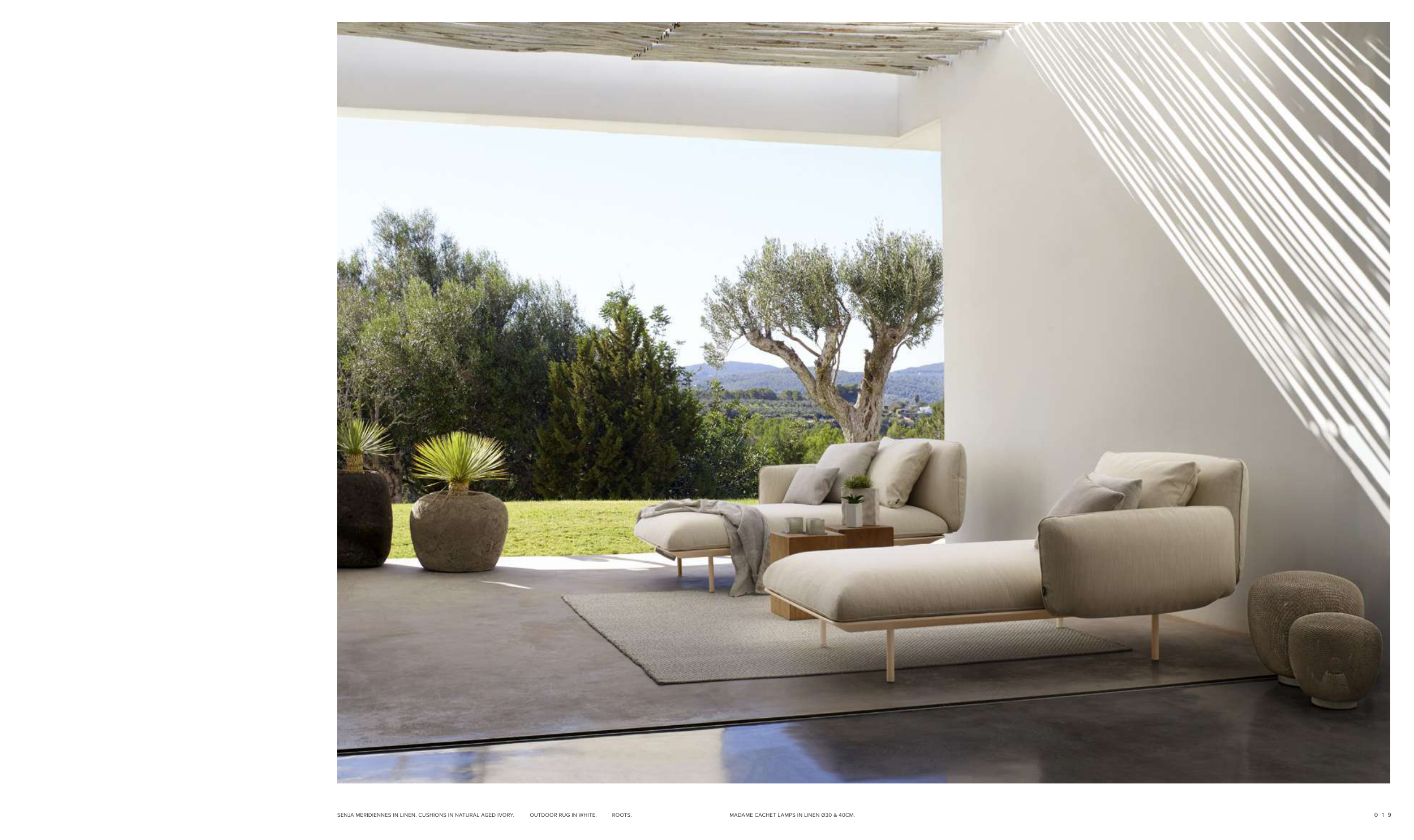 SENJA MERIDIENNES IN LINEN, CUSHIONS IN NATURAL AGED IVORY. OUTDOOR RUG IN WHITE. ROOTS. MADAME CACHET LAMPS IN LINEN Ø30 & 40CM.