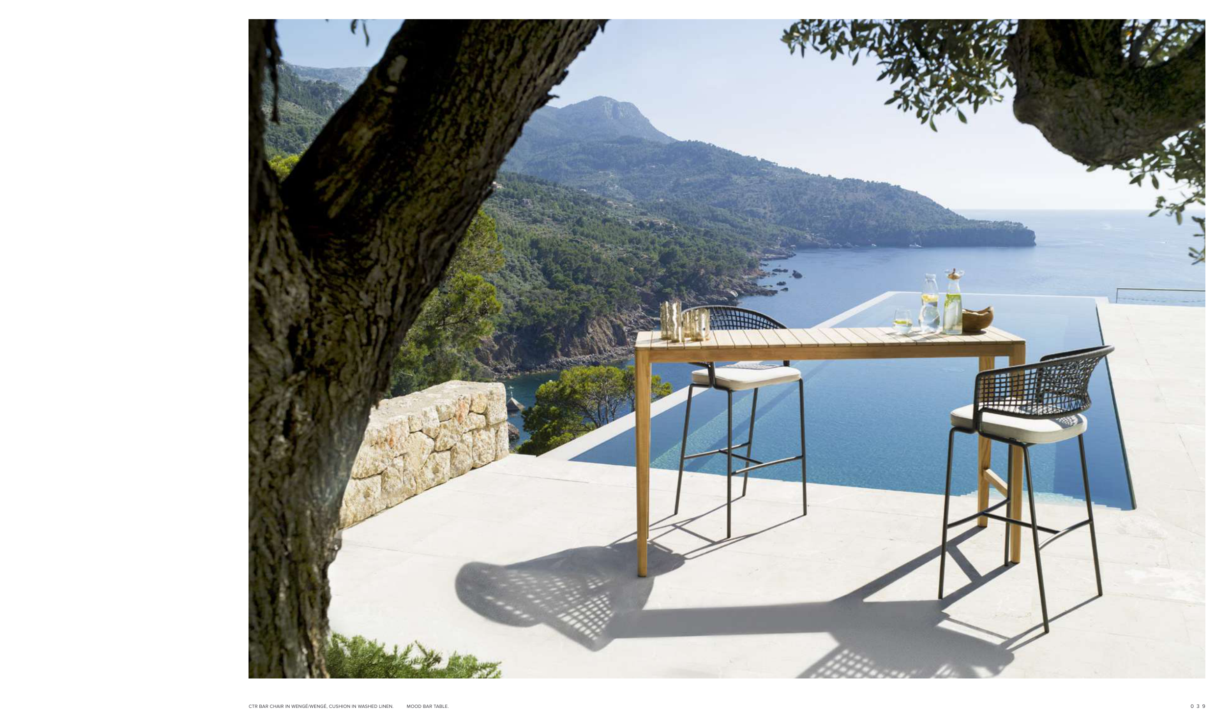 CTR BAR CHAIR IN WENGÉ/WENGÉ, CUSHION IN WASHED LINEN. MOOD BAR TABLE.