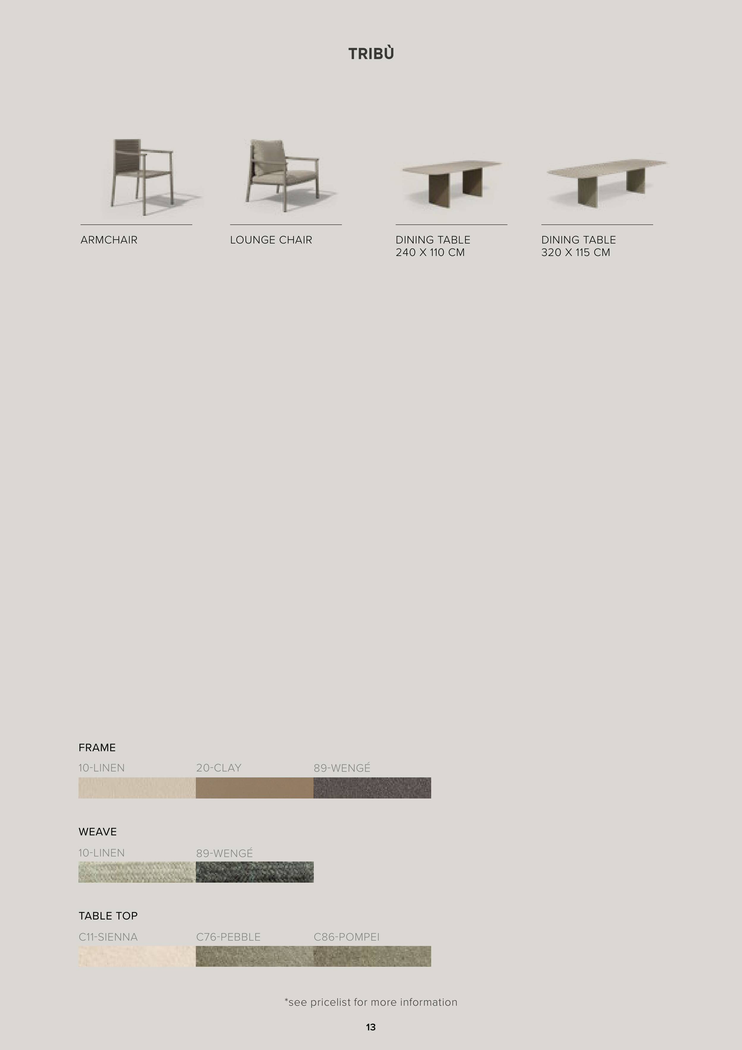 13 ARMCHAIR LOUNGE CHAIR *see pricelist for more information DINING TABLE 240 X 110 CM DINING TABLE 320 X 115 CM FRAME 10-LINEN 20-CLAY 89-WENGÉ WEAVE 10-LINEN 89-WENGÉ TABLE TOP C11-SIENNA C76-PEBBLE C86-POMPEI