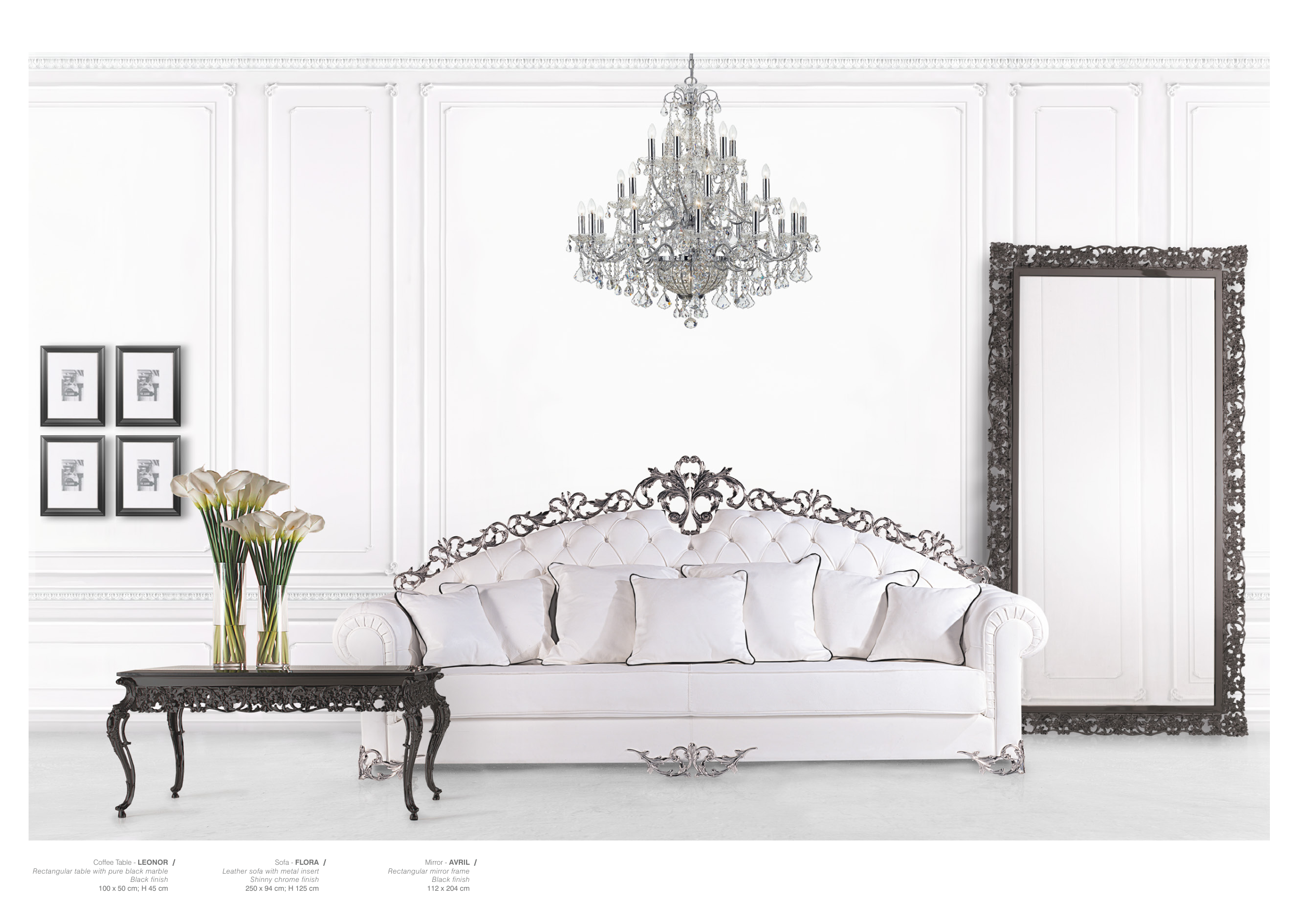 / / / Coffee Table - LEONOR Rectangular table with pure black marble Black finish 100 x 50 cm; H 45 cm Sofa - FLORA Leather sofa with metal insert Shinny chrome finish 250 x 94 cm; H 125 cm Mirror - AVRIL Rectangular mirror frame Black finish 112 x 204 cm