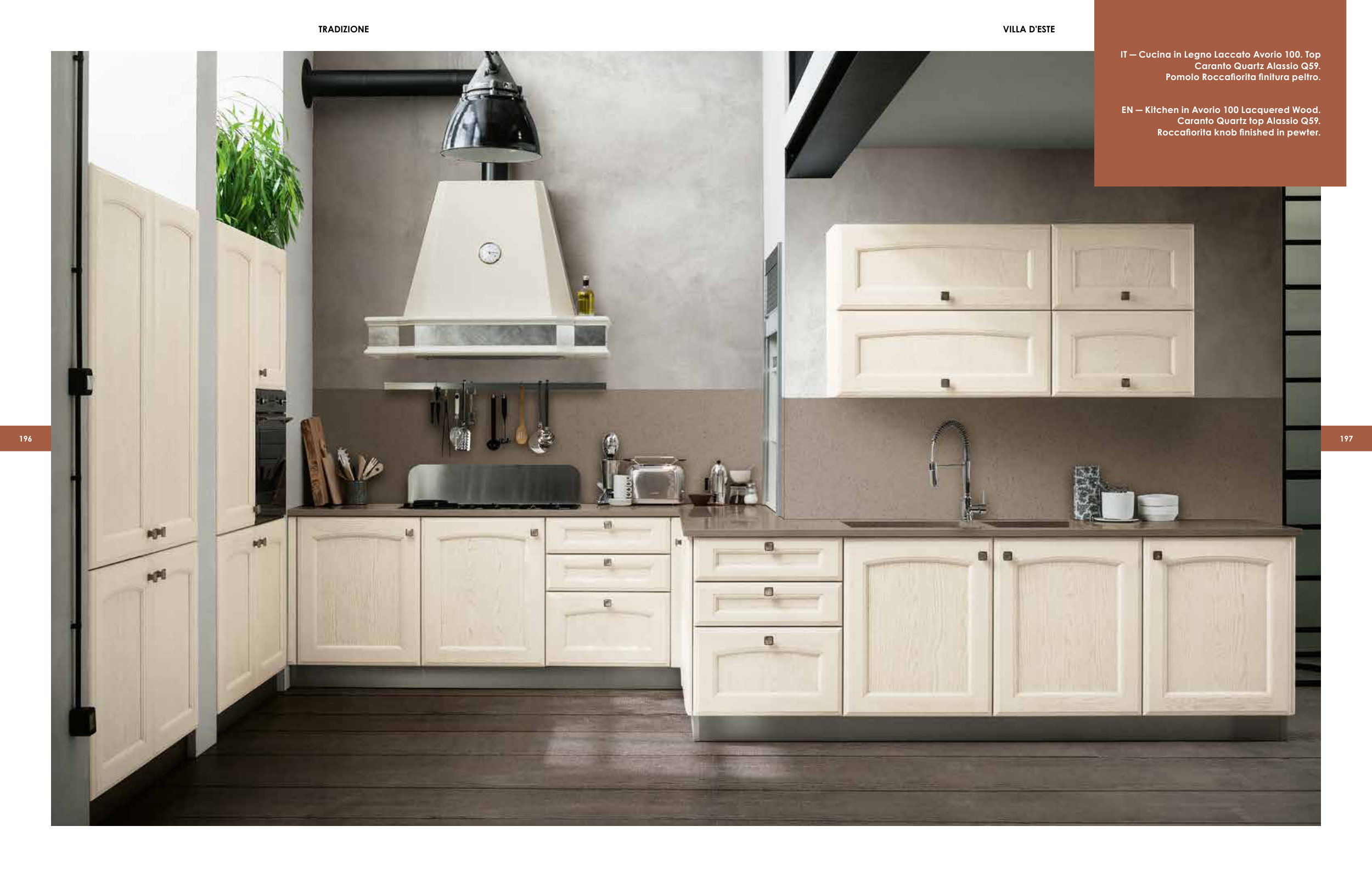 196 197 TRADIZIONE IT ― Cucina in Legno Laccato Avorio 100. Top Caranto Quartz Alassio Q59. Pomolo Roccafiorita finitura peltro. VILLA D'ESTE EN ― Kitchen in Avorio 100 Lacquered Wood. Caranto Quartz top Alassio Q59. Roccafiorita knob finished in pewter.