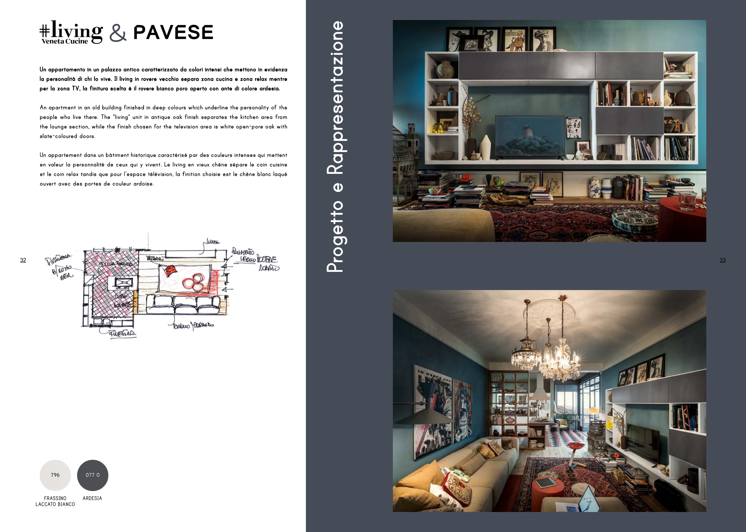 per la zona TV, la finitura scelta è il rovere bianco poro aperto con ante di colore ardesia.