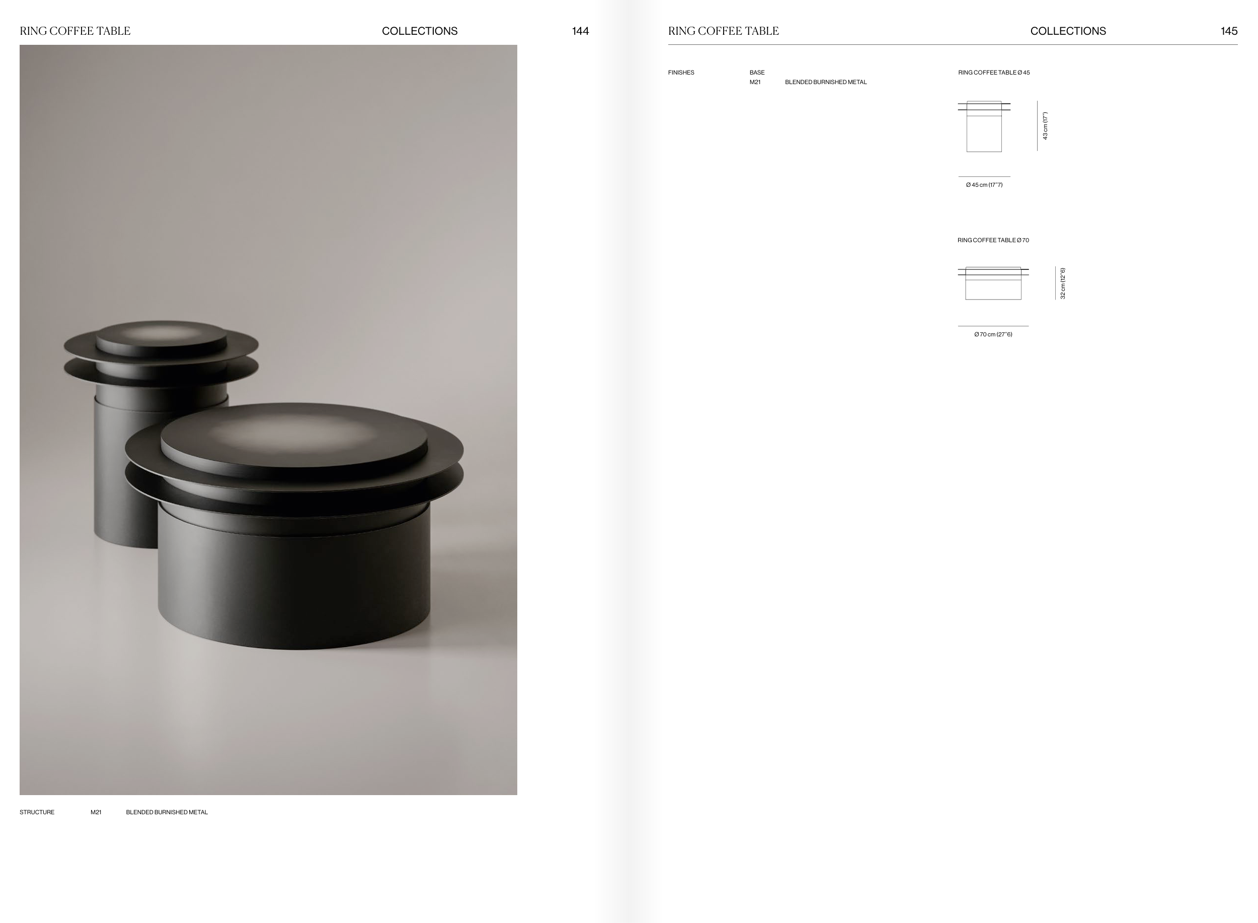 FINISHES BASE M21 BLENDED BURNISHED METAL RING COFFEE TABLE RING COFFEE TABLE STRUCTURE M21 BLENDED BURNISHED METAL 144 145 COLLECTIONS COLLECTIONS 43 cm (17”) Ø 45 cm (17”7) RING COFFEE TABLE Ø 45 RING COFFEE TABLE Ø 70 32 cm (12”6) Ø 70 cm (27”6)