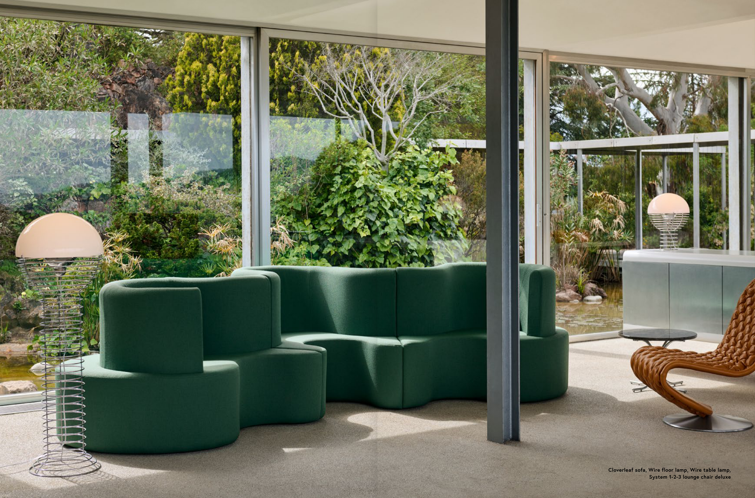 Cloverleaf sofa, Wire floor lamp, Wire table lamp,