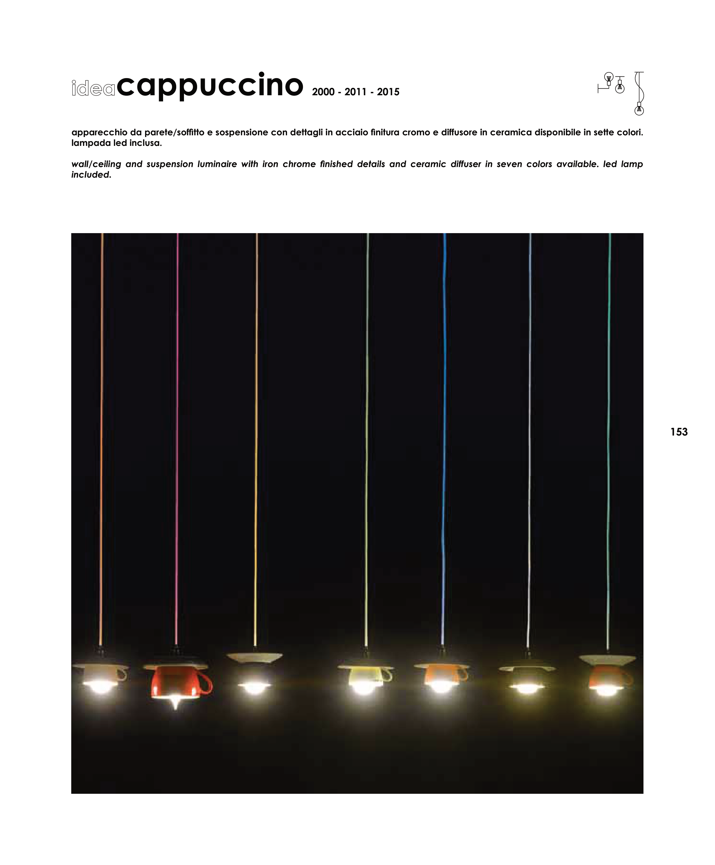 wall/ceiling and suspension luminaire with iron chrome finished details and ceramic diffuser in seven colors available. led lamp