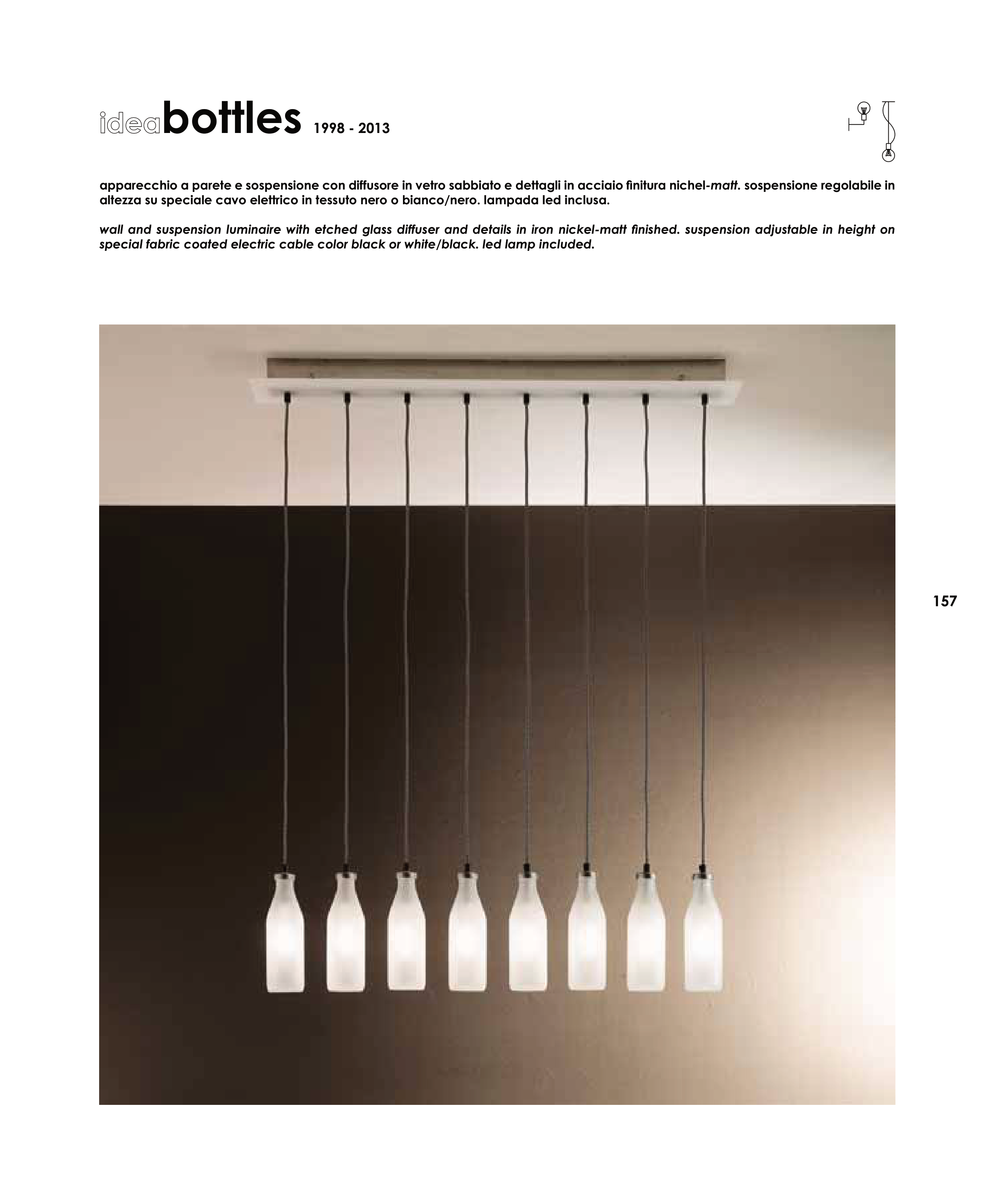 apparecchio a parete e sospensione con diffusore in vetro sabbiato e dettagli in acciaio finitura nichel-matt. sospensione regolabile in