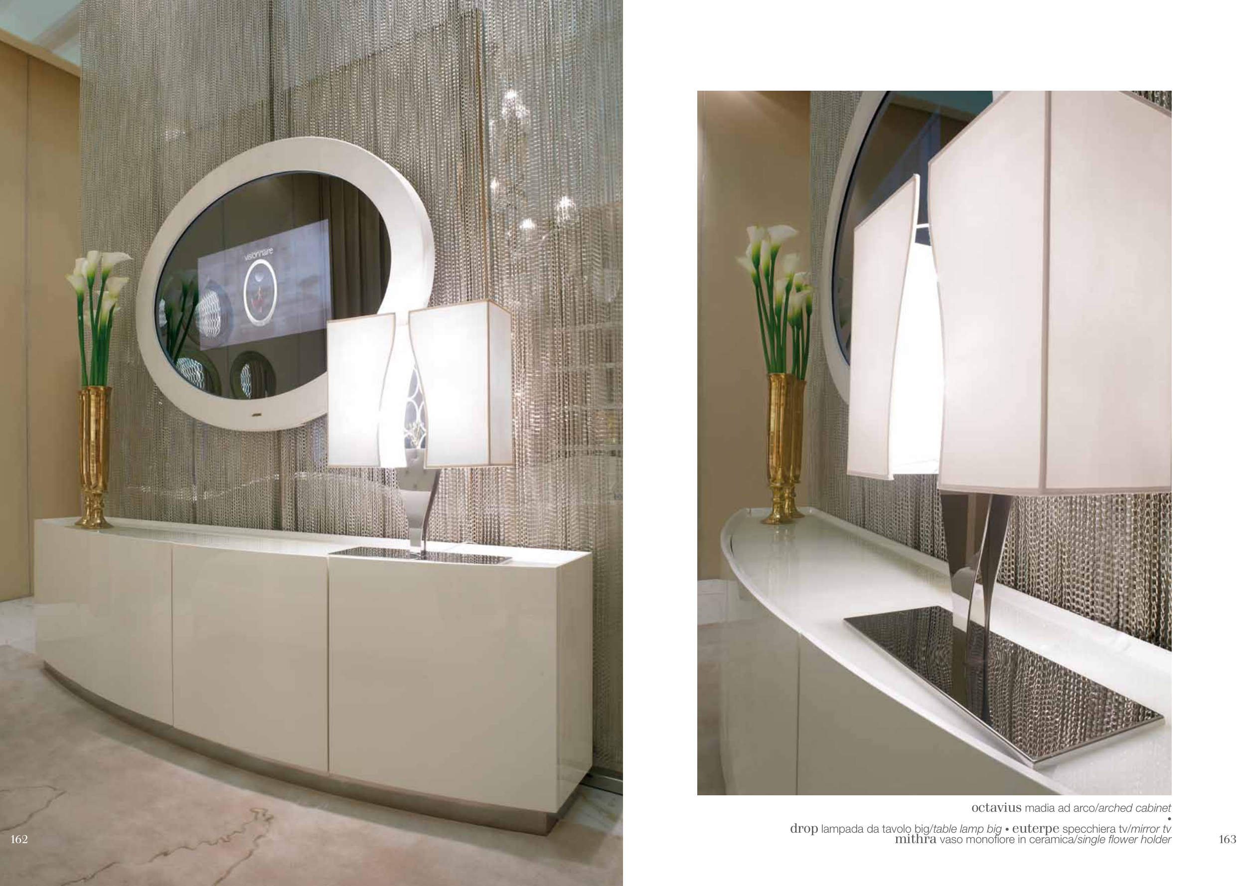octavius madia ad arco/arched cabinet • drop lampada da tavolo big/table lamp big • euterpe specchiera tv/mirror tv mithra vaso monofiore in ceramica/single flower holder 162 163