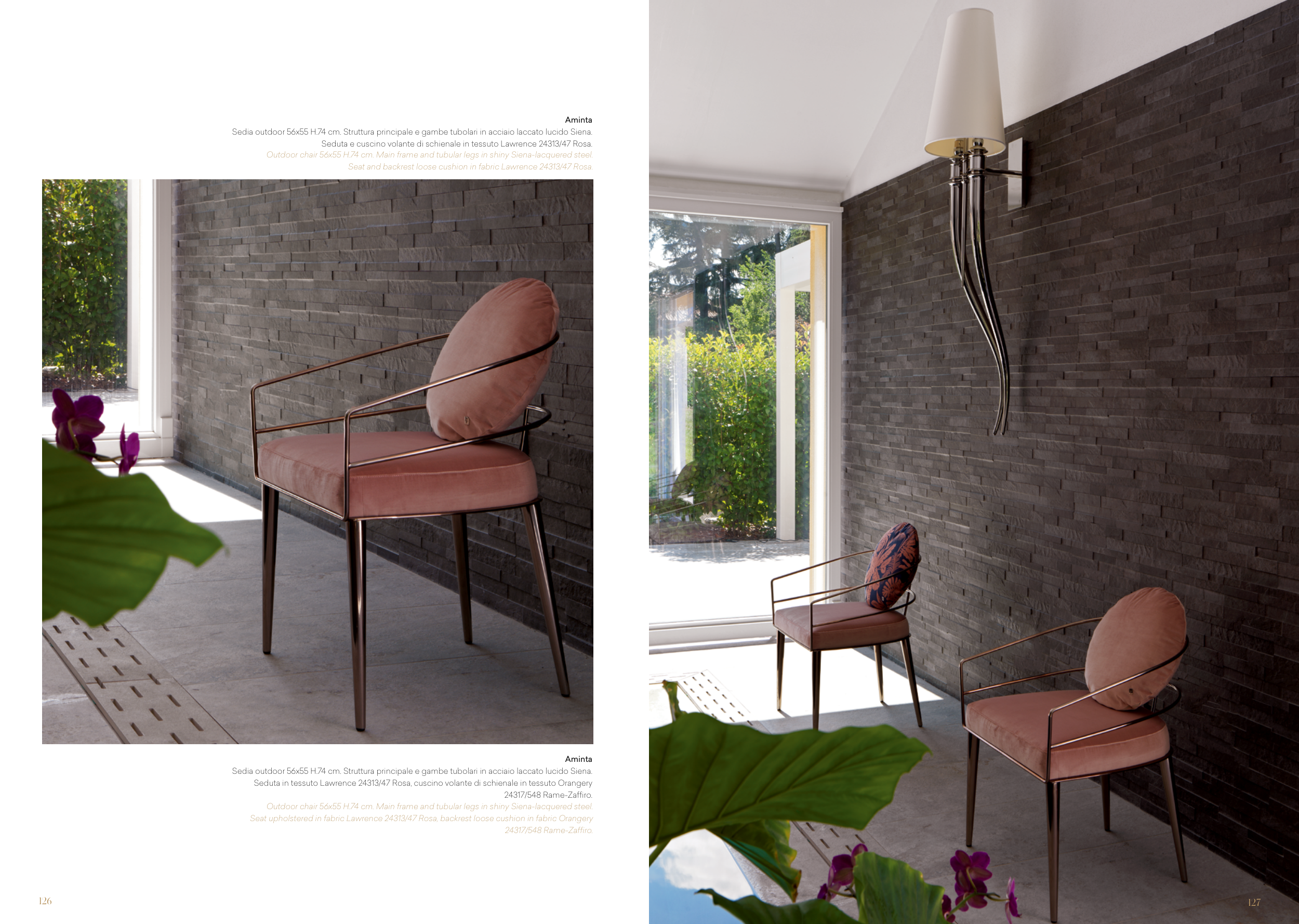 Outdoor chair 56x55 H.74 cm. Main frame and tubular legs in shiny Siena-lacquered steel.